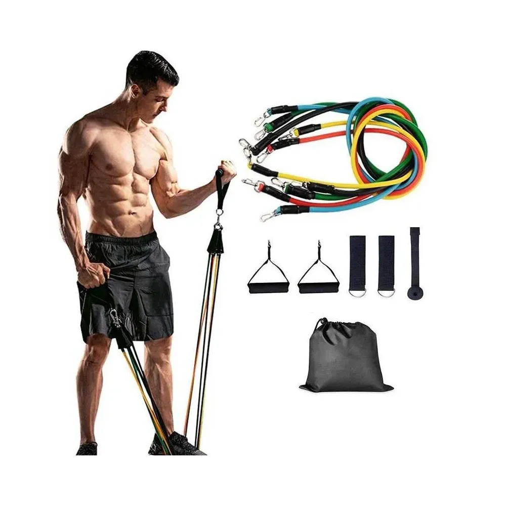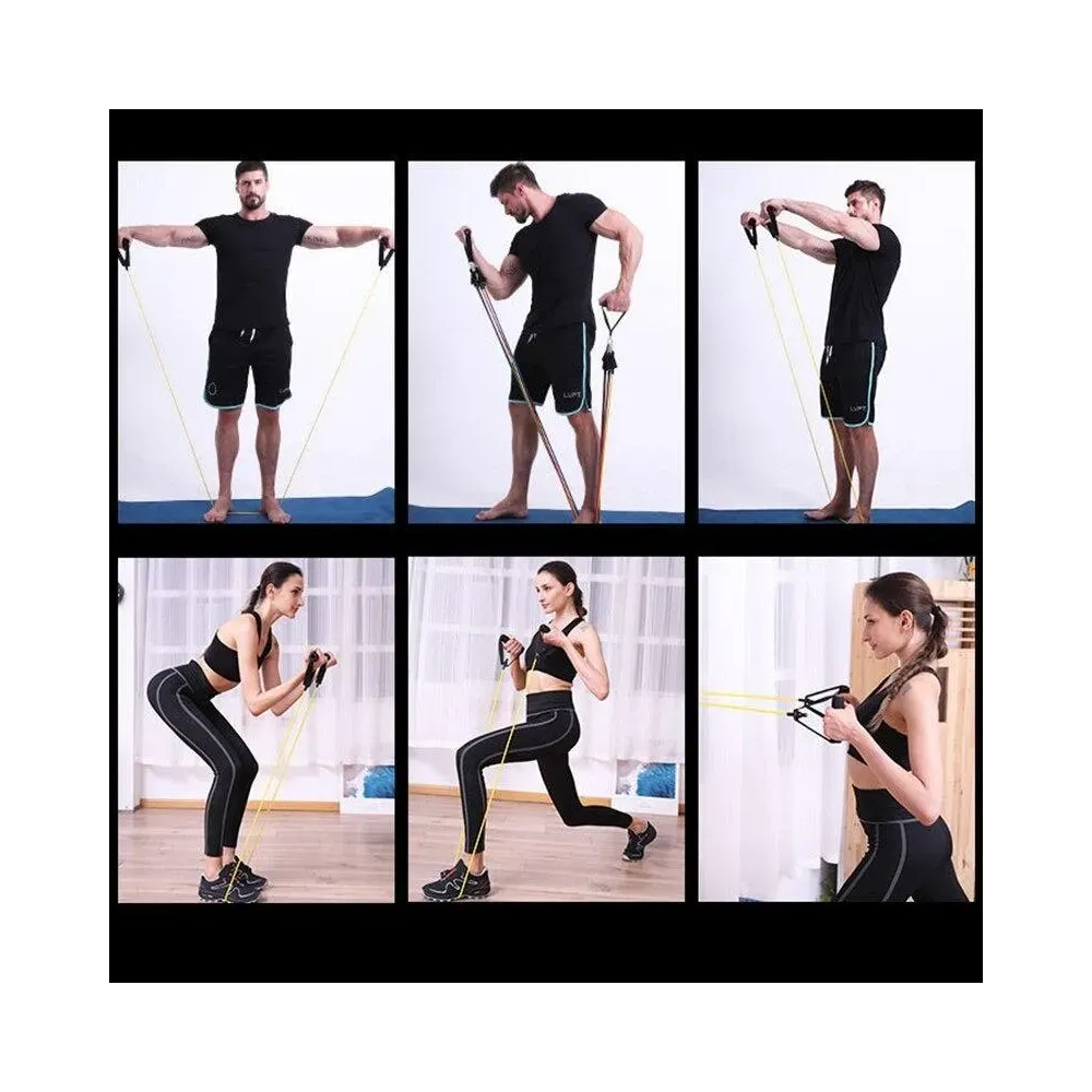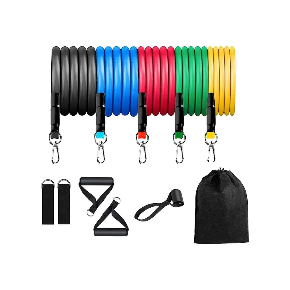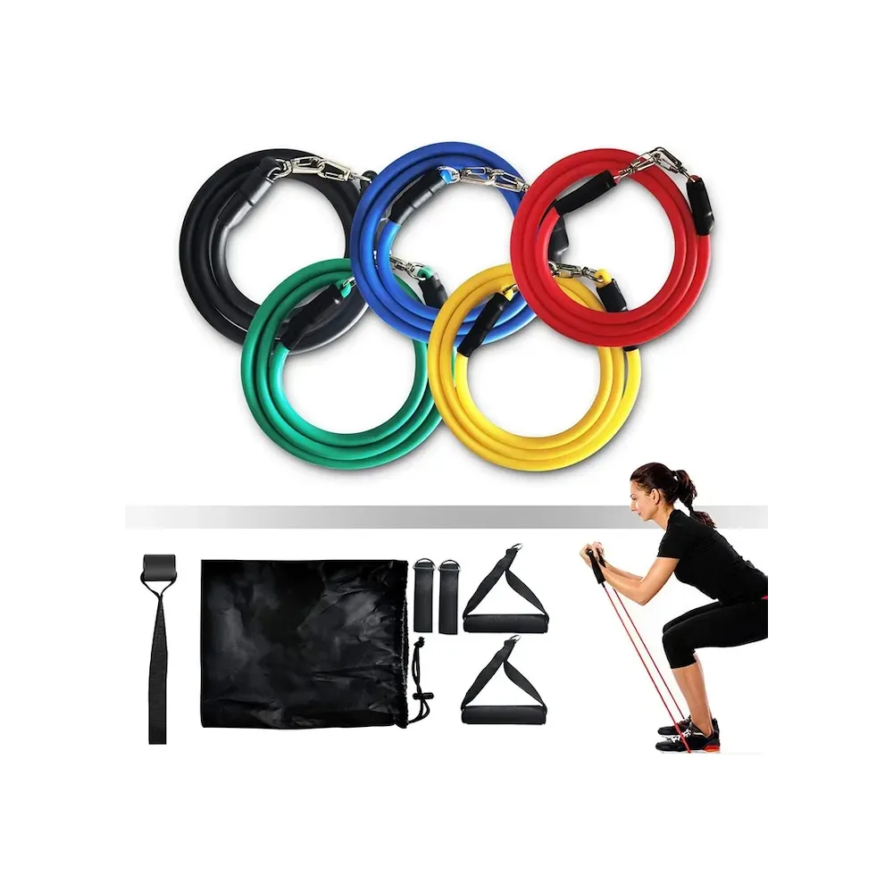 -Sistem de Antrenament Fitness - Set Extensor 11 Piese - 5 Corzi / Benzi Elastice Extensibile din Latex pentru Muschi Abdominali, Piept, Biceps, Triceps, Umeri, Spate, Picioare