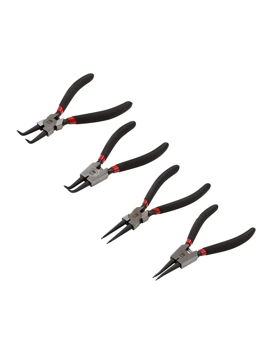 Acest set include cu 4 clesti de siguranta drepti si curbati pentru sigurante seeger de interior si exterior cu varf curbat la 90 grade si cu varf drept.