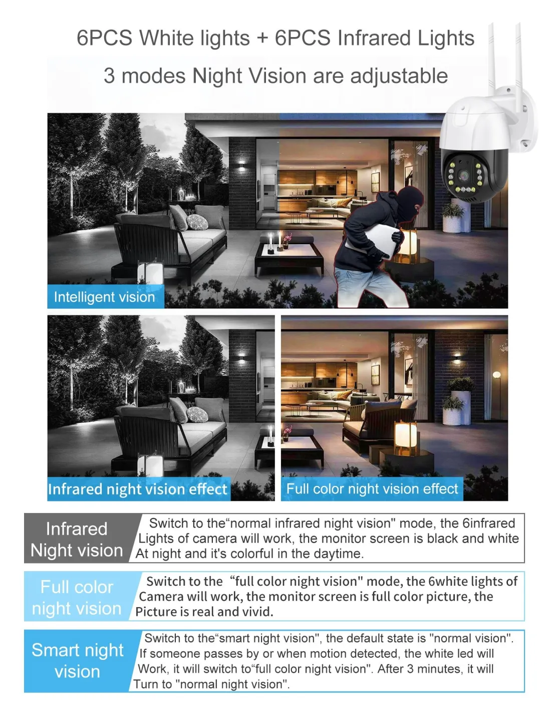 - Vizibilitate nocturnă: Echipată cu 12 LED-uri IR pentru imagini clare chiar și pe întuneric.