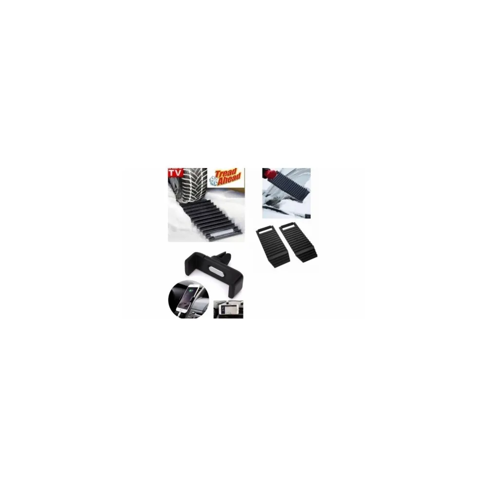Pachetul include:- 1 x Suport auto telefon- 2 x Benzi antiderapante pentru automobil Benzi antiderapante pentru automobilEchipeaza-ti automobilul cu noile benzi anti-derapante, Tread Ahead, si iarna aceasta nu vei mai ramane blocat in zapada sau in noroi!Acest covoras din material dur se pune sub roti ajutandu-le sa aiba aderenta si sa iasa mai repede din zapada sau noroi,De asemenea, poate fi folosit ca racleta pentru inlaturarea ghetii sau zapezii de pe geamurile masinii, Tread Ahead este o adevarata comoara pentru persoanele care au de-a face cu zapada, gheata sau noroi,Dimensiuni aprox: 33 cm x 15 cm x 3 cm,Pachetul contine: Set 2 buc covor anti-derapant Tread Ahead,Fabricat in SUA, *Fotografiile sunt cu titlu de prezentare!+Suport Auto Grila / Ventilatie Telefon Universal Reglabil 360 GradeSuport auto pentru telefoane mobile cu deisgn minimalist si dimensiuni reduse, Fixarea suportului se face pe lamelele grilei de ventilatie a autoturismului,Permite fixarea telefonului atat pe verticala cat si pe orizontala, pentru a asigura vizionarea optima in functie de aplicatie sau preferintele personale,Suportul auto este proiectat pentru mentinerea dispozitivului detinut intr-o pozitie fixa si stabila,Adaptabil si demn de incredere, suportul auto ocupa un loc central intr-o solutie de comunicare facila si utilizarea in conditii de maxima siguranta la volan,Suportul mobil se poate atasa cu usurinta pe Grila / Ventilatie, pastrand telefonul in siguranta in timp ce dumneavoastra conduceti,Pentru Telefon / Smartphone , GPS , Camere , Mp3 , PDA ect, Specificatii:Culoare: NegruMaterial: Plastic/ABS cu SiliconFixare: Grila / VentilatieDeschidere suport: Minim 5,7 cm , Maxim: 8,4 cmProtectie telefon: SiliconRotire suport: 360 Grade Pachetul Contine:1X Suport Auto Grila / Ventilatie1x Cutie/Ambalaj prezentare