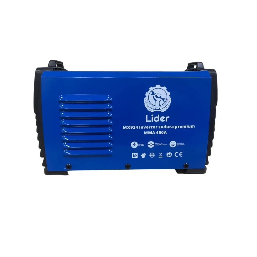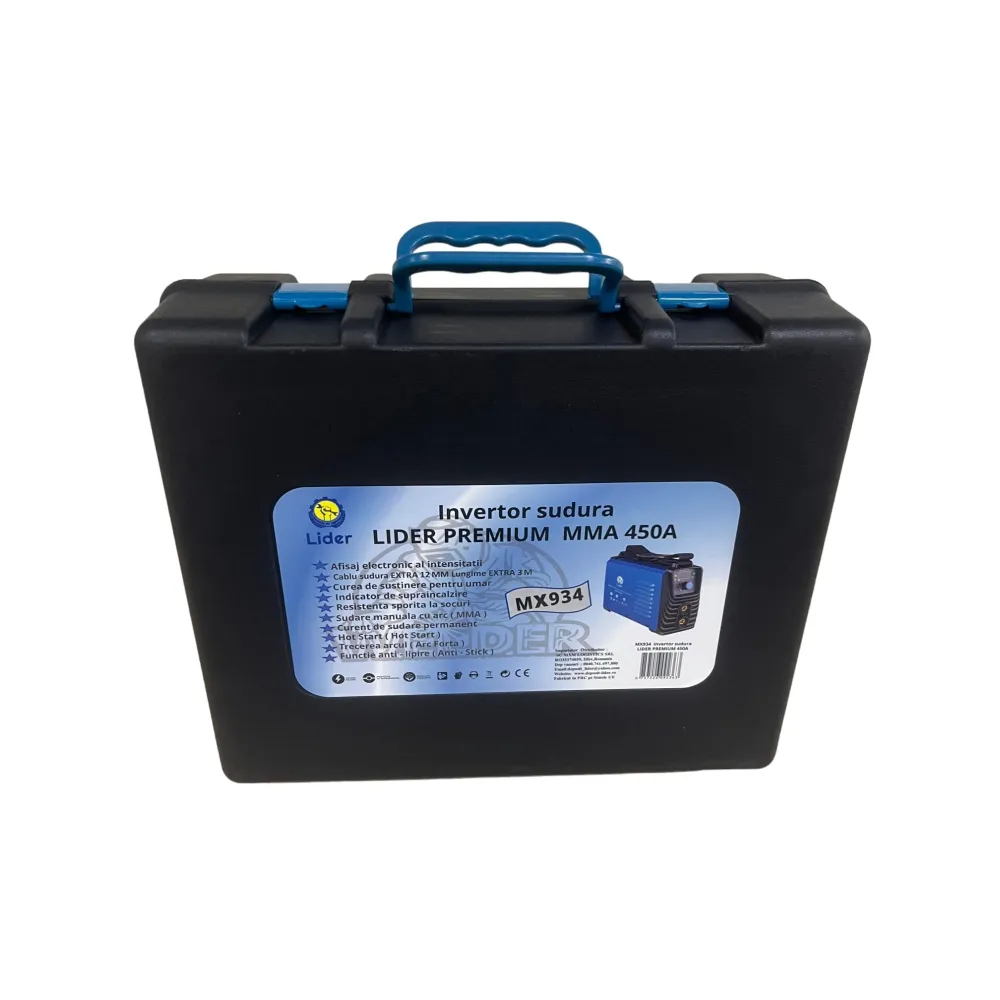 Aparatul de sudură LIDER PREMIUM MMA 450A MX934 este un transformator de curent cc sudează cu arc electric folosind electrozi acoperiți MMA sau TIG ce pornesc arcul electric prin contact.