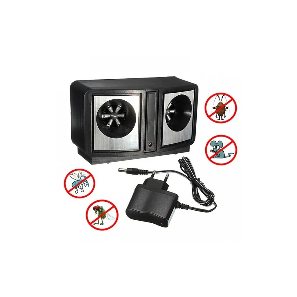 Aparat cu 2 difuzoare impotriva daunatorilor sau insectelor, fara efecte asupra animalului de companie. Aparatul impotriva daunatorilor emite sunete cu o frecventa intre 24-45 kHz pe o raza de 200 mp. Frecventa este reglabila,dispune de un buton de test,are un led de functionare in partea din fata, 2 difuzoare, se utilizeaza conectat la priza de 220V.