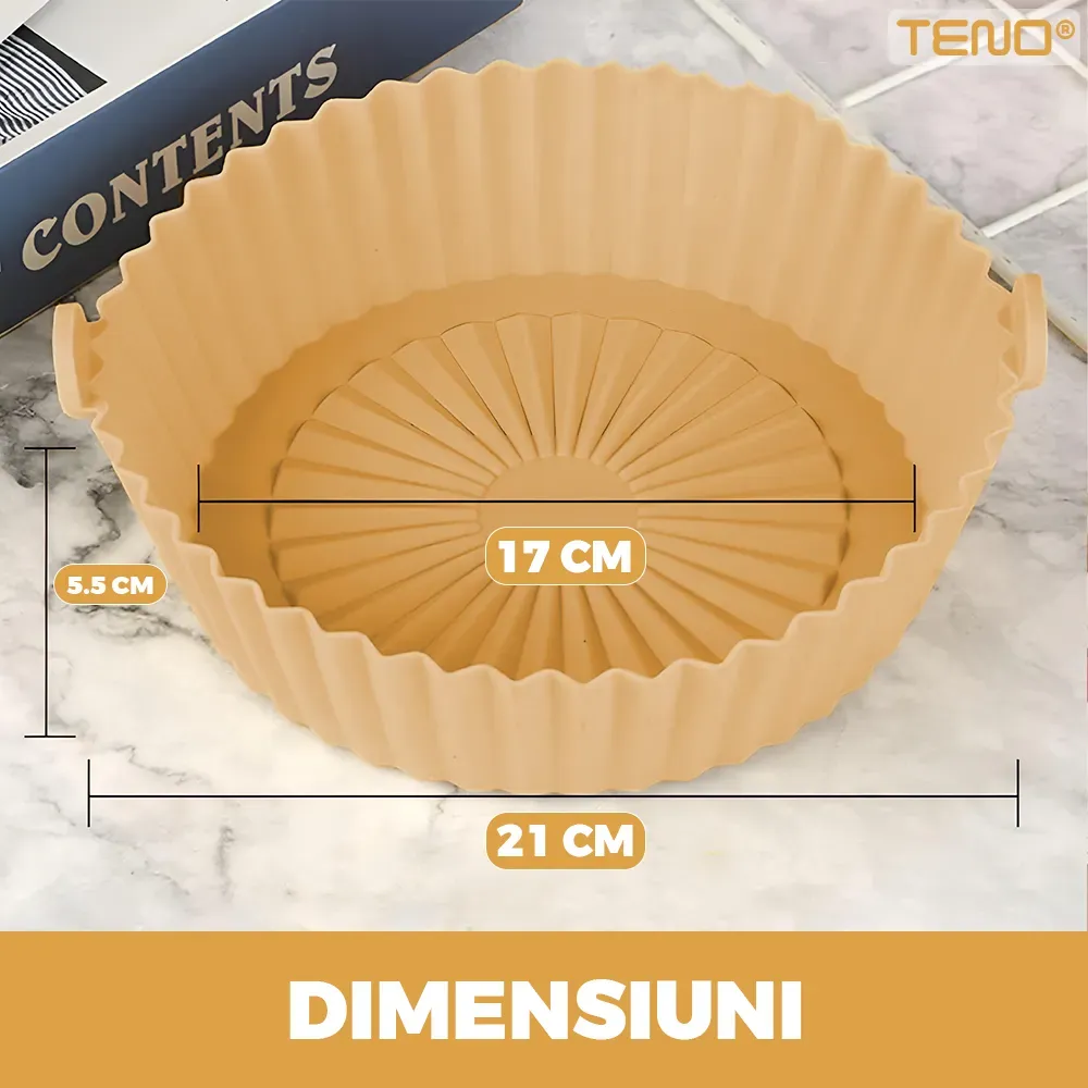 „Tava siliconică antiaderentă pentru Air Fryer – 20 cm este ușor de folosit și perfectă pentru gătitul rapid și sănătos. Pur și simplu așază tava în coșul Air Fryer-ului, adaugă ingredientele dorite și setează timpul și temperatura potrivită.