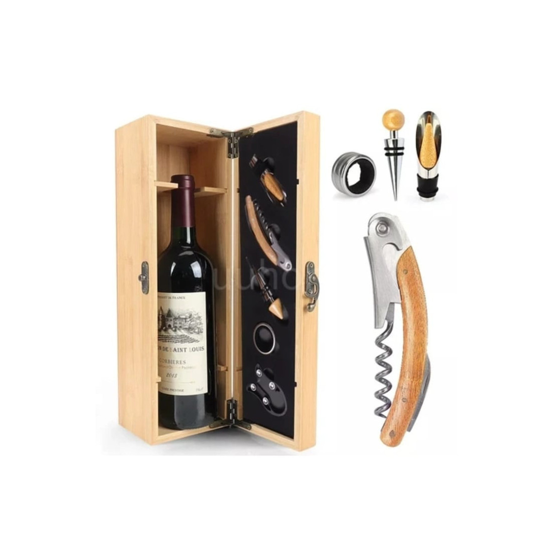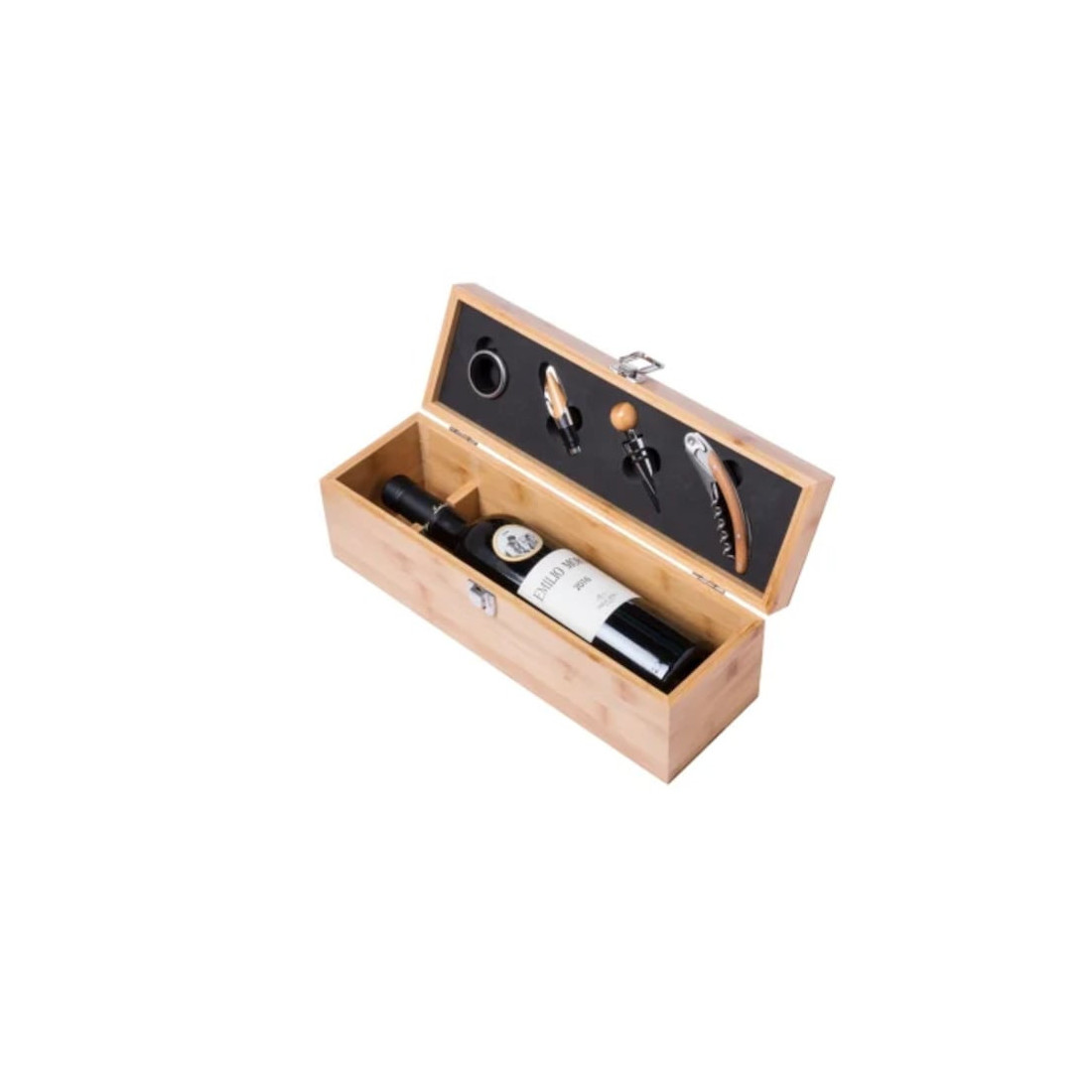 Set elegant în cutie de lemn cu accesorii pentru vin – tirbușon profesional, dop elegant, inel antipicurare și cutter folie