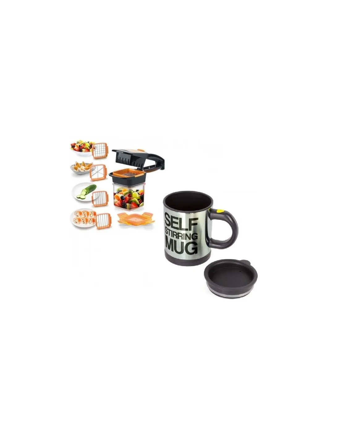 Pachetul contine:1 x Feliator Nicer Dicer1 x Cana cu amestecare automata Self MugCu dispozitivul Nicer Dicer Brava vei putea taia sub forma de cubulete si sferturi, toca si marunti toate tipurile de legume si fructe, Vei putea taia fructele si legumele in mult mai putin timp si cu mai putin efort, Tehnologia de taiere rapida cu trei lame diferite, interschimbabile, se combina intr-un feliator foarte compact, care taie felii groase si subtiri; cubulete si sticks-uri, chiar si 6 felii wedges intr-o secunda fara nici o problema!5 motive pentru care te vei indragosti de Feliatorul, Nicer Dicer Quick,Mic si compact: este un dispozitiv manual, compact si foarte usor de folositExtrem de ascutit: va ramane mereu ascutit datorita lamelor G-nox din otel inoxidabilUsor de depozitat: se poate impacheta foarte usor si il poti depozita chiar si in sertarele mai miciMobil: il poti lua cu tine oriundeSigur: butonul de blocare mentine lamele in pozitie inchisa, asadar il poti depozita in siguranta oriunde,1x Feliator Nicer Dicer Quick; cadru de feliere cu buton de blocare integrat3x Lame; orificiu superior pentru introducerea lamei, orificiu inferior pentru introducerea lamei, orificiu pentru introducerea lamelor pentru taiat wedges1x Rama1x Recipient, capacitate: 200 ml1x Capac etans+Cana cu mixer ideala pentru amestecarea laptelui cu ciocolata, siropuri, nectar, etc,Functioneaza cu 2 baterii AA, neicluse in pachet,Capacitate: aproximativ 350 mlDimensiune: aproximativ 20 cmGreutate: aproximativ 240 grame