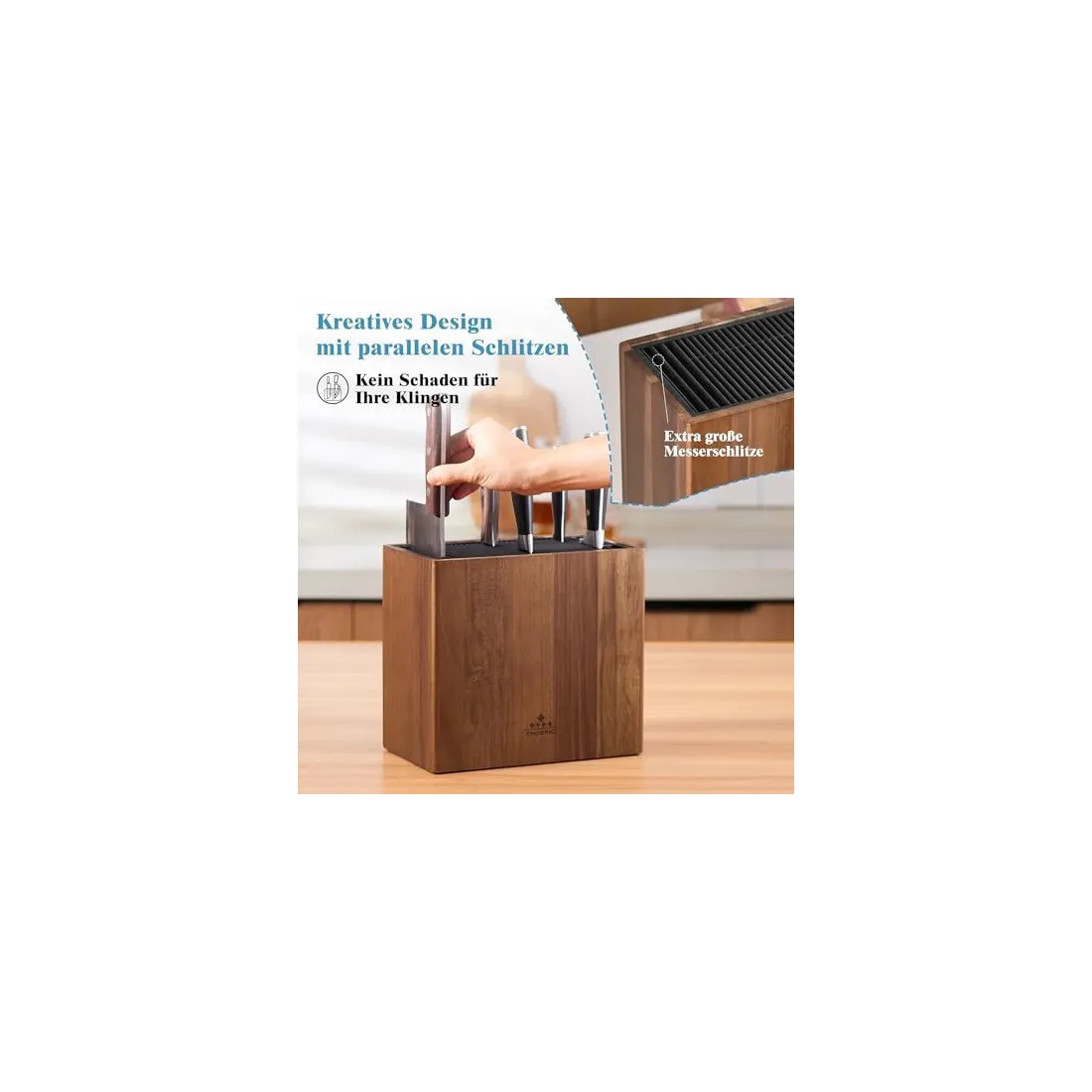 - Design creativ cu sloturi paralele: Sloturile paralele separă lamele cuțitelor, prevenind contactul dintre ele. Acest design inovator protejează tăișurile și permite inserarea și scoaterea ușoară a cuțitelor.
