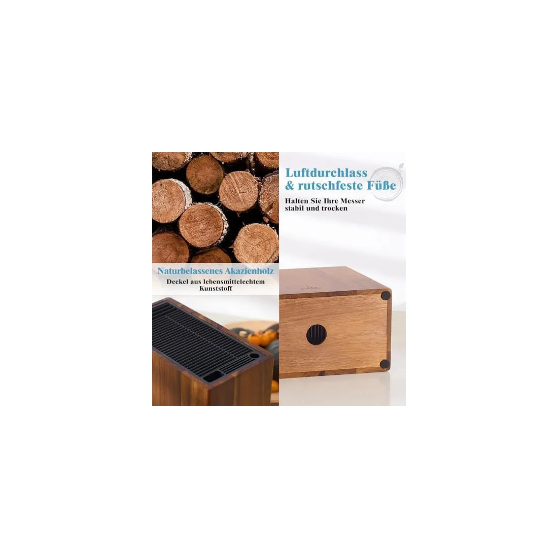 - Lemn natural de salcâm și capac din plastic alimentar: Lemnul de salcâm este renumit pentru durabilitate și rezistență, cu un aspect natural deosebit care se potrivește oricărei bucătării. Depozitarea cuțitelor într-un suport din lemn previne tocirea prematură a lamelor, evitând frecarea cu alte metale. Capacul din plastic este rezistent, fără a lăsa urme vizibile pe lame.