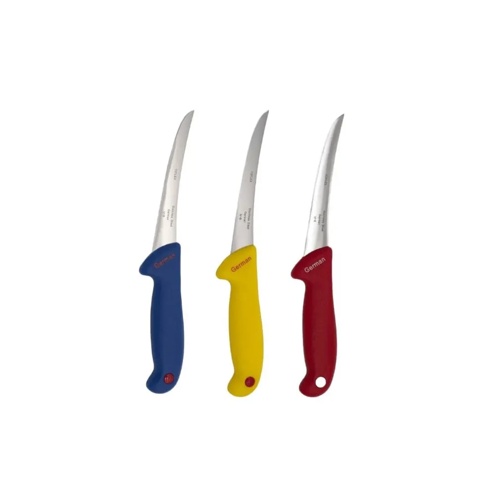Cuțitele sunt unelte indispensabile în orice măcelărie sau bucătărie profesională. Acest set de 3 cuțite profesionale este conceput pentru a vă oferi performanță, durabilitate și precizie la fiecare utilizare. Cu lame fabricate din oțel german de calitate superioară și mânere ergonomice din plastic dur, acest set este ideal pentru a tranșa, dezosa și porționa cu ușurință orice tip de carne.