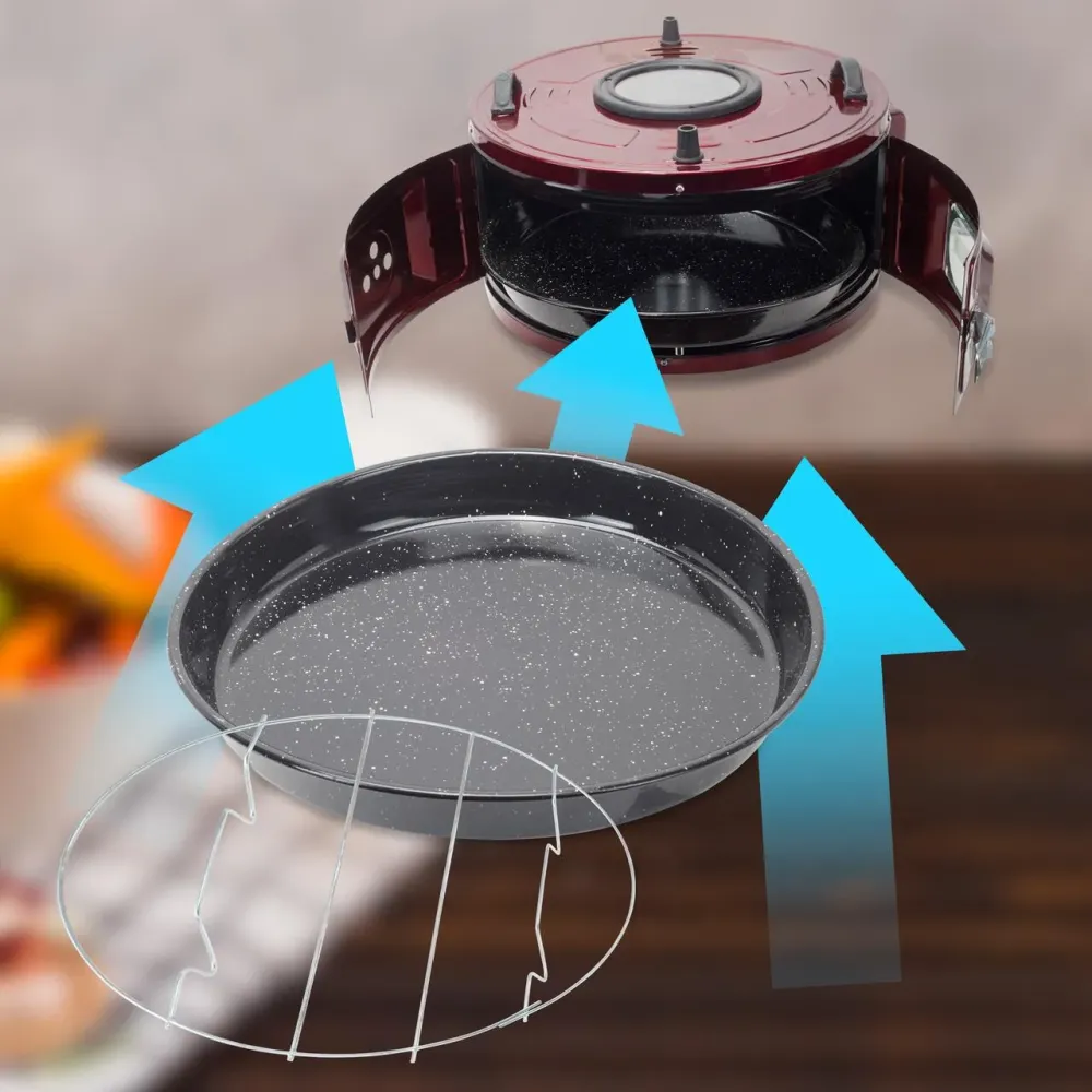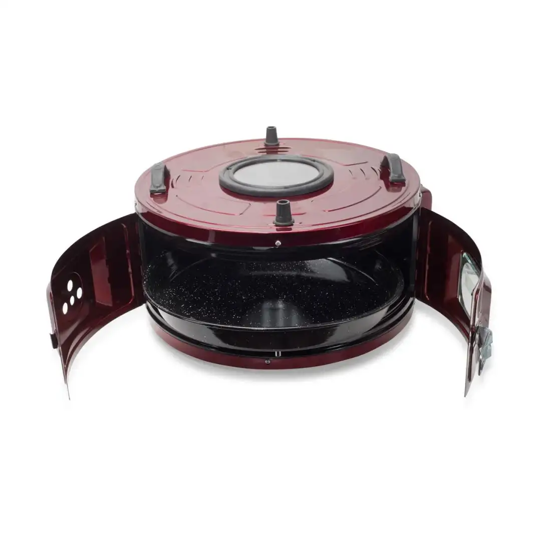Design si Constructie: Acest model are o usa cu vizor din sticla, permitand vizualizarea facila a alimentelor in timpul gatitului fara a deschide usa si a pierde caldura. Manerele integrate faciliteaza transportul usor al cuptorului, facandu-l practic pentru diferite situatii, cum ar fi mutarea intr-o noua locuinta sau utilizarea in spatii diferite.