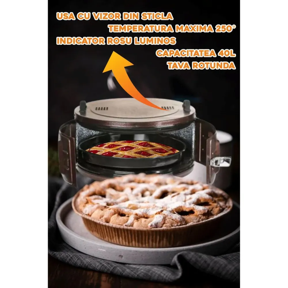 Capacitate si Dimensiuni: Capacitatea de 40l este generoasa pentru un cuptor electric de dimensiuni compacte, avand dimensiunile exterioare de 46 x 46 x 29 cm. Acest lucru il face potrivit pentru gatitul unei game variate de alimente, de la prajituri la fripturi sau chiar pizza pe tava rotunda inclusa.