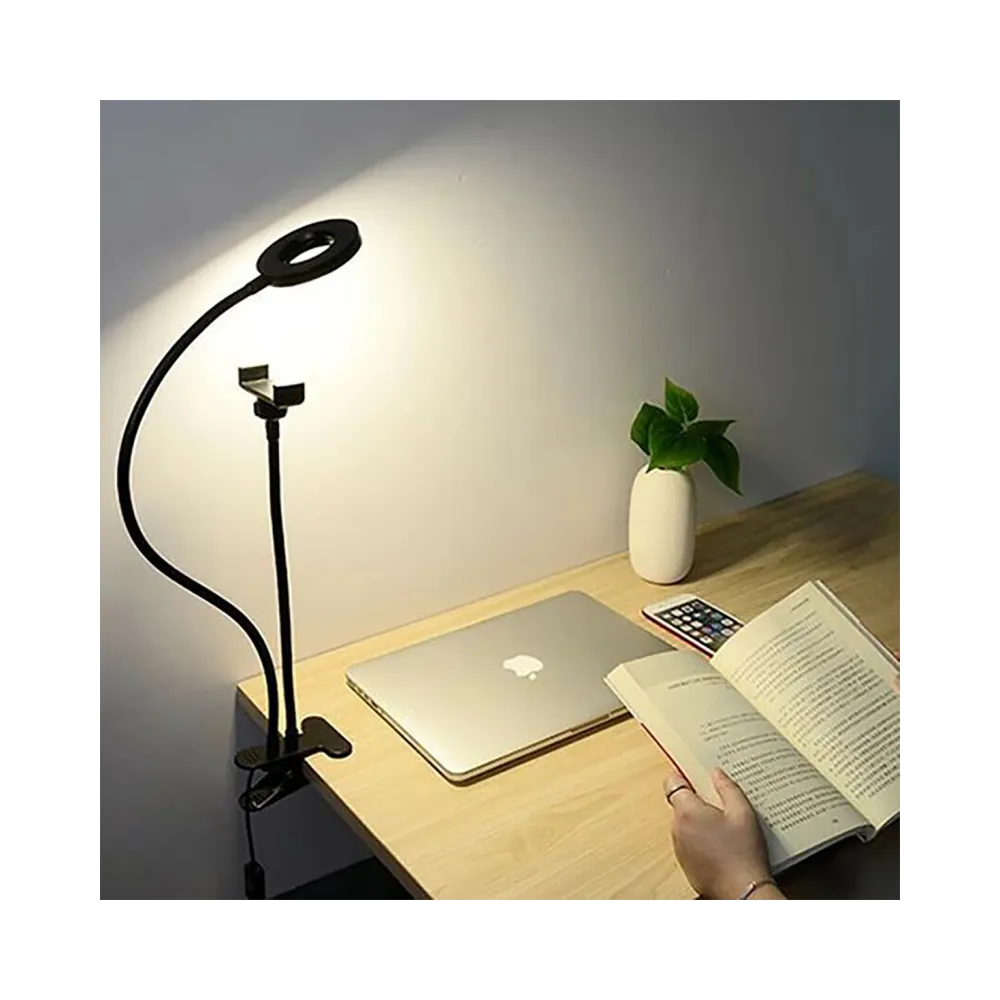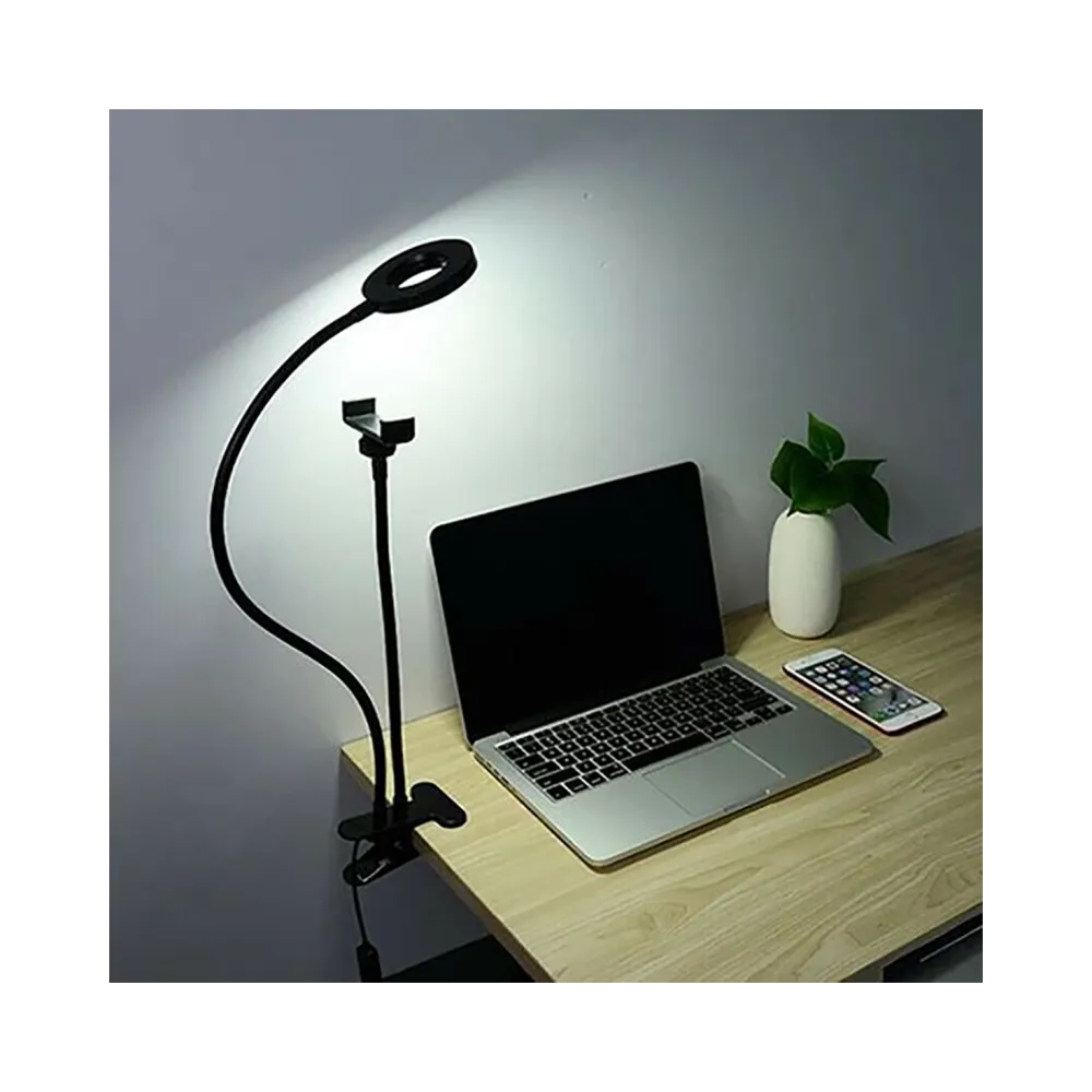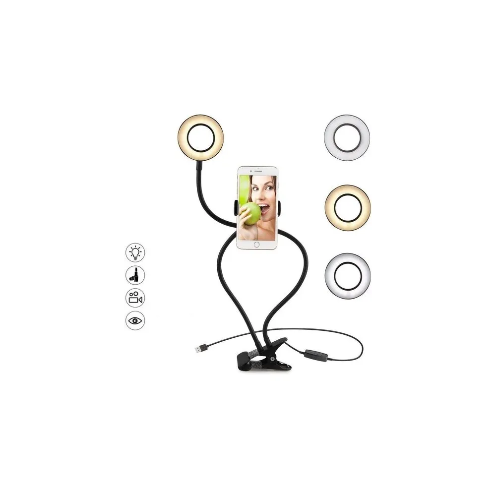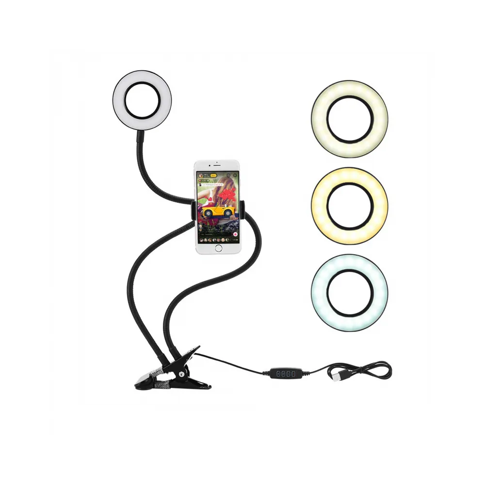 Deșurubați mânerul pentru telefon de la suport și introduceți telefonul, apoi întoarceți-l în suport și înșurubați-l din nou. Atașați suportul la o placă solidă, de exemplu, masă, raft … Conectați cablul USB la un computer sau la o sursă de alimentare … Când ai totul pregătit, poți începe să faci selfie-uri. Lumina LED are trei niveluri pentru selectarea luminii .