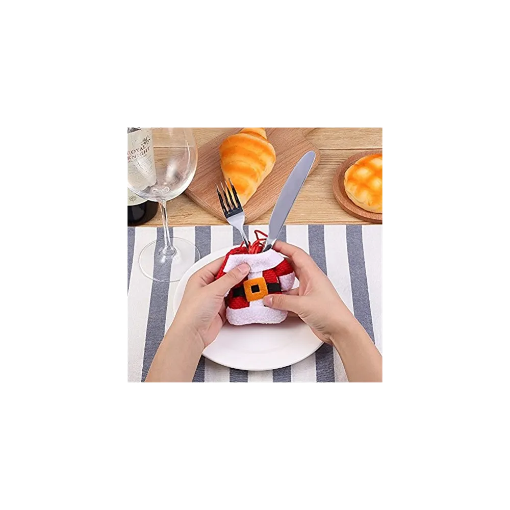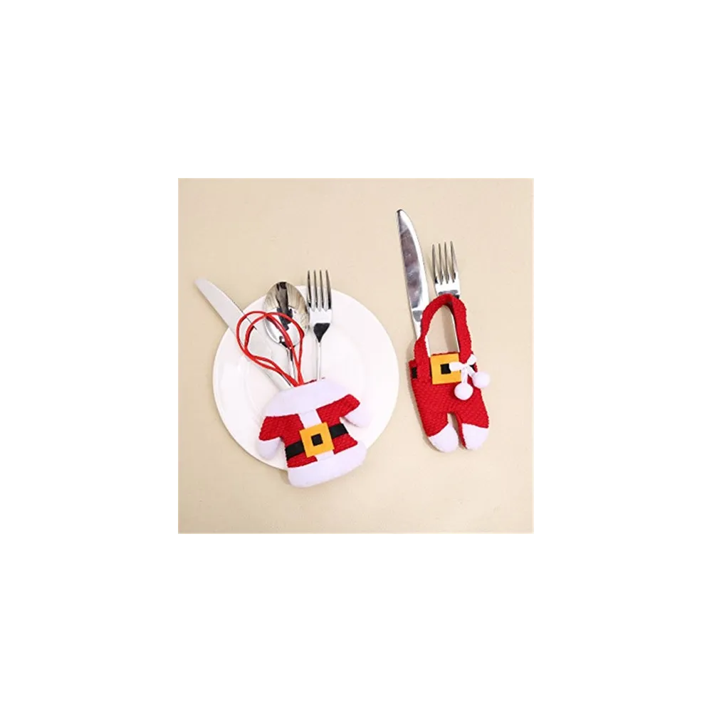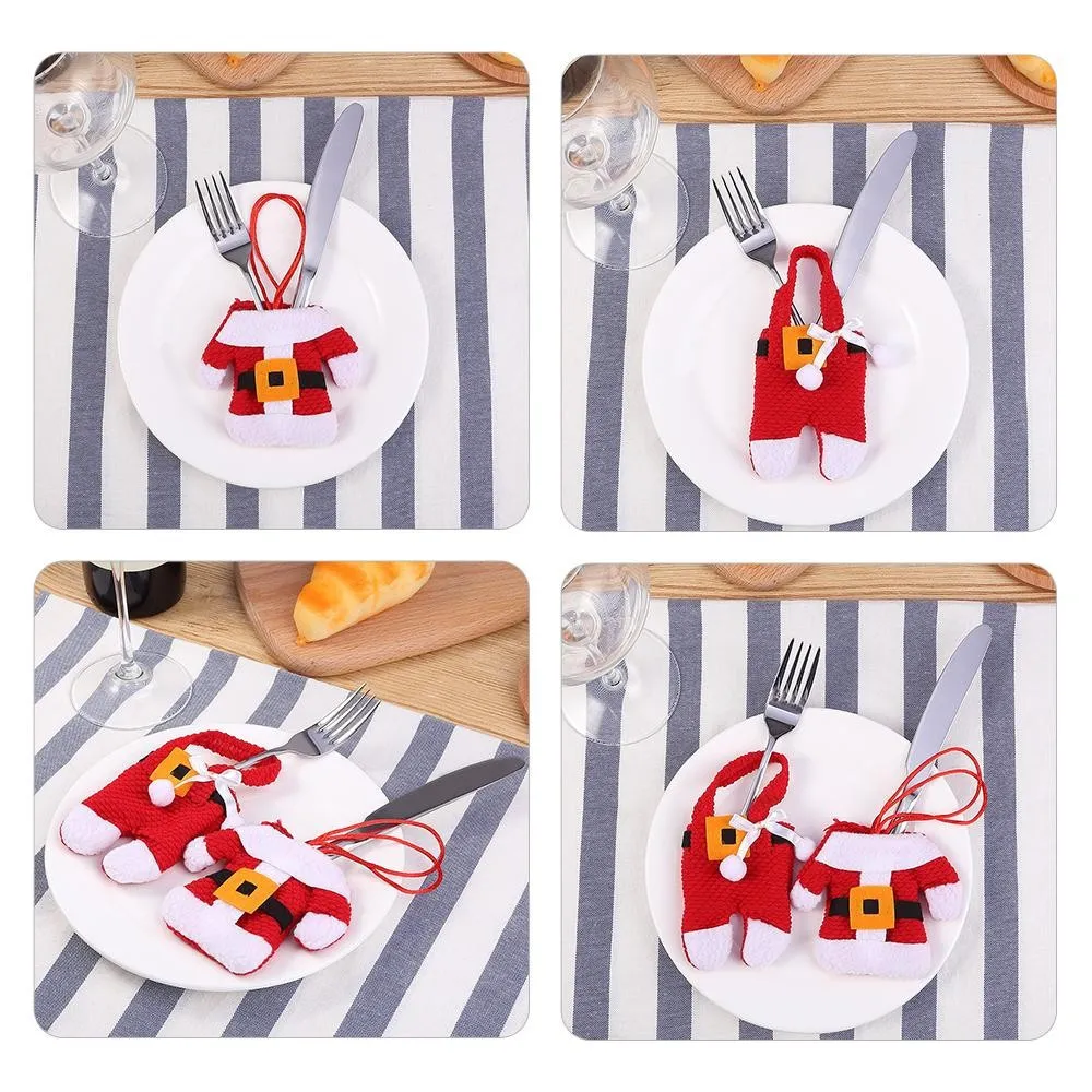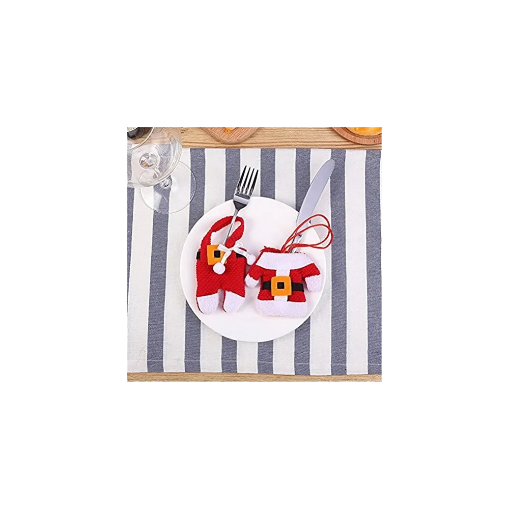 Un accesoriu decorativ de efect, perfect pentru mesele festive din timpul sarbatorilor de iarna. Set de suporturi textile pentru tacamuri, cu forma sic de costum de mos craciun cu deschiderea superioara de aproximativ 8 cm.