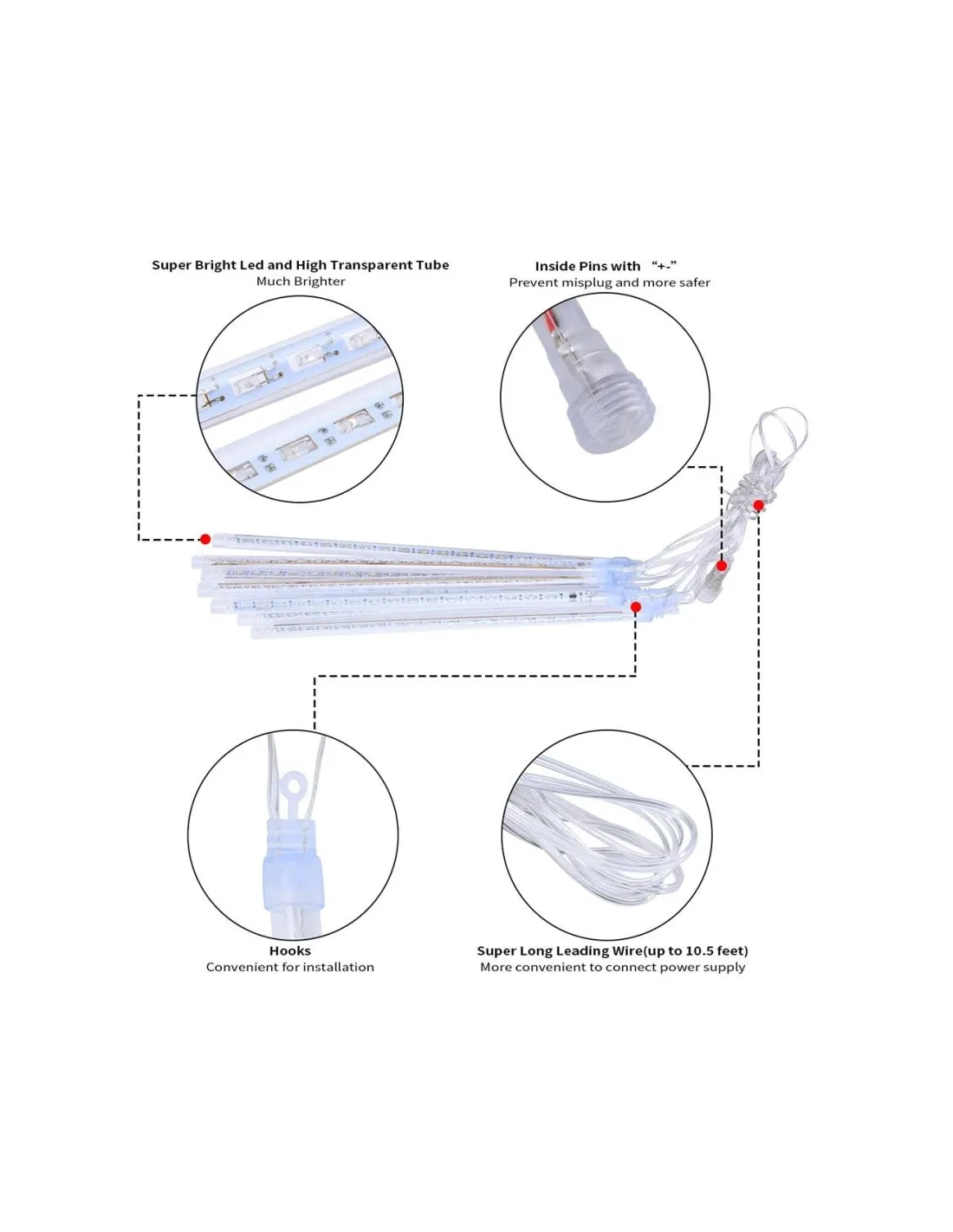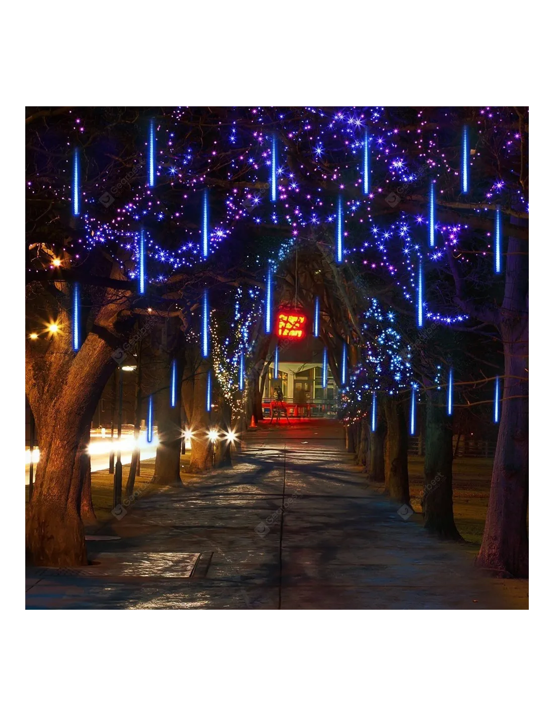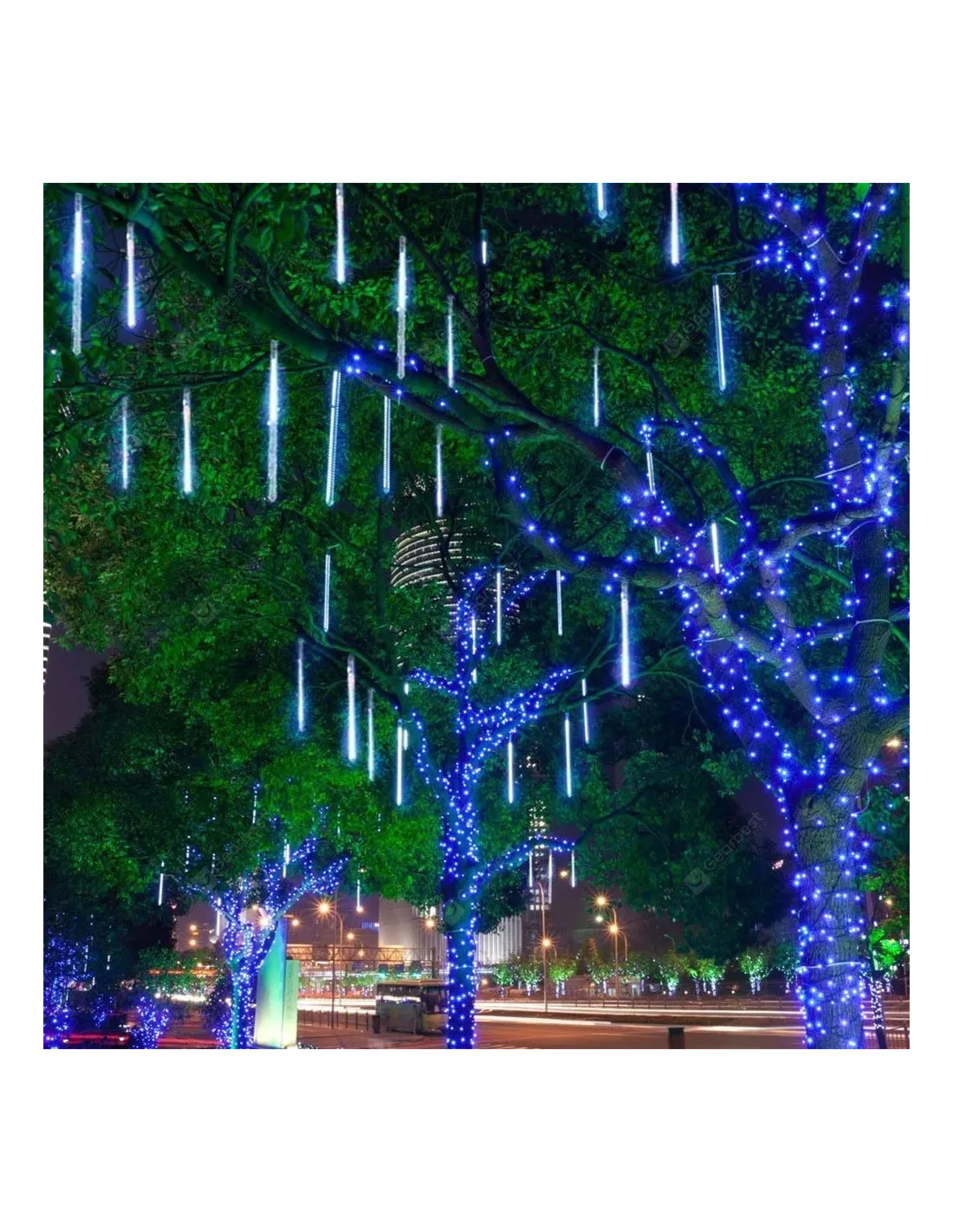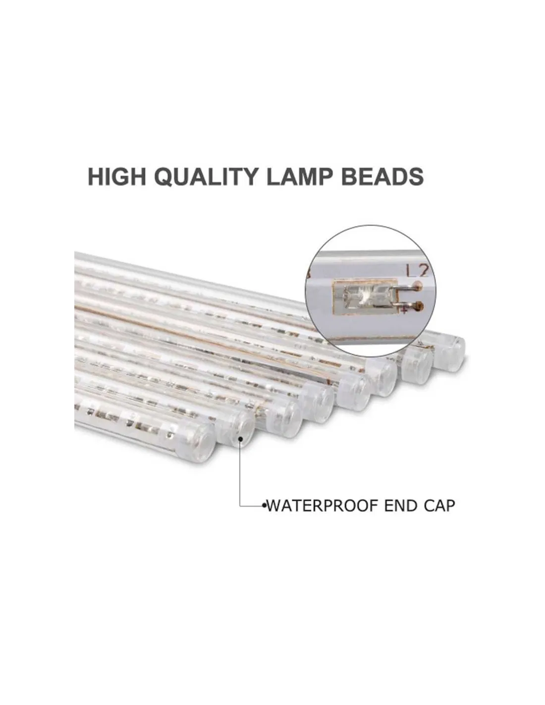 Instalație LED tip meteorit 80 cm, 8 tuburi luminoase, interconectabilă, cu efect de ninsoare. Disponibilă alb rece, albastru sau multicolor. Perfectă pentru decor interior și exterior protejat, alimentare 220V.