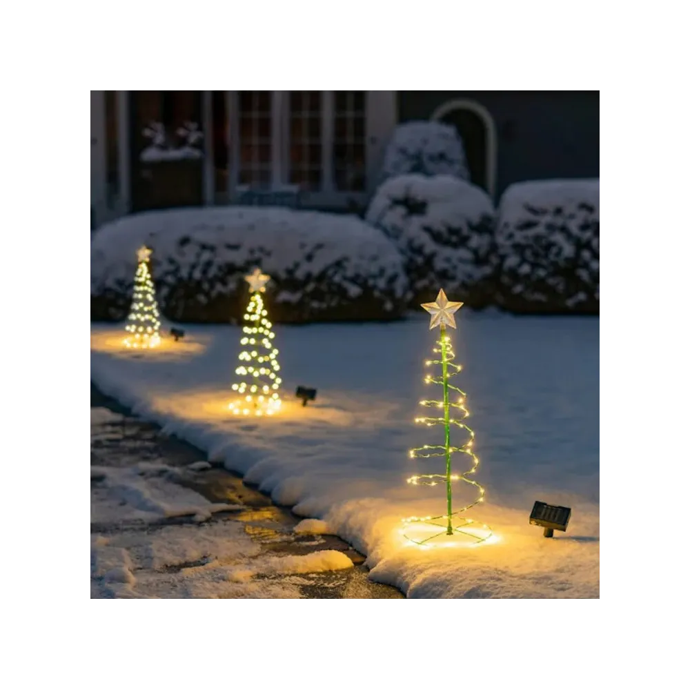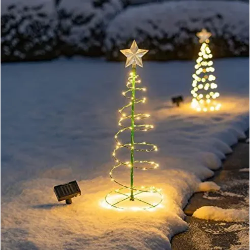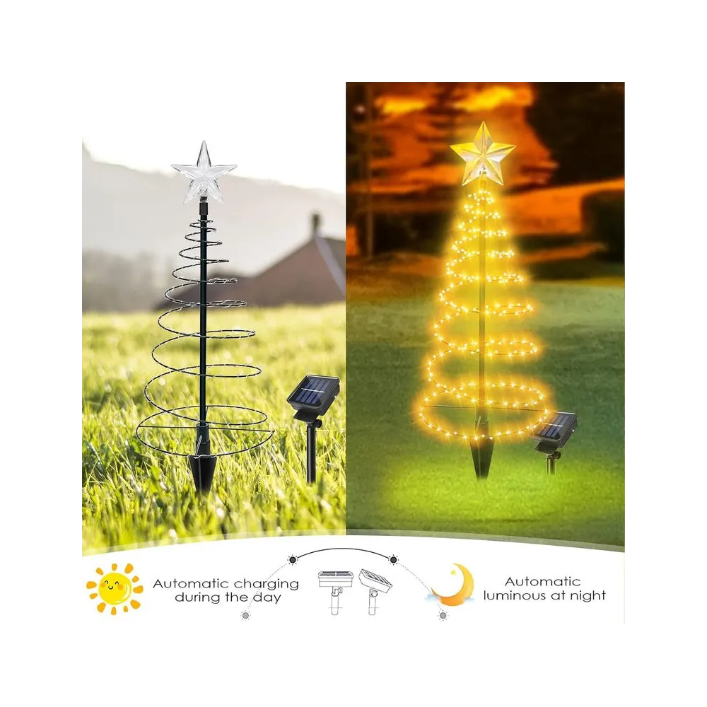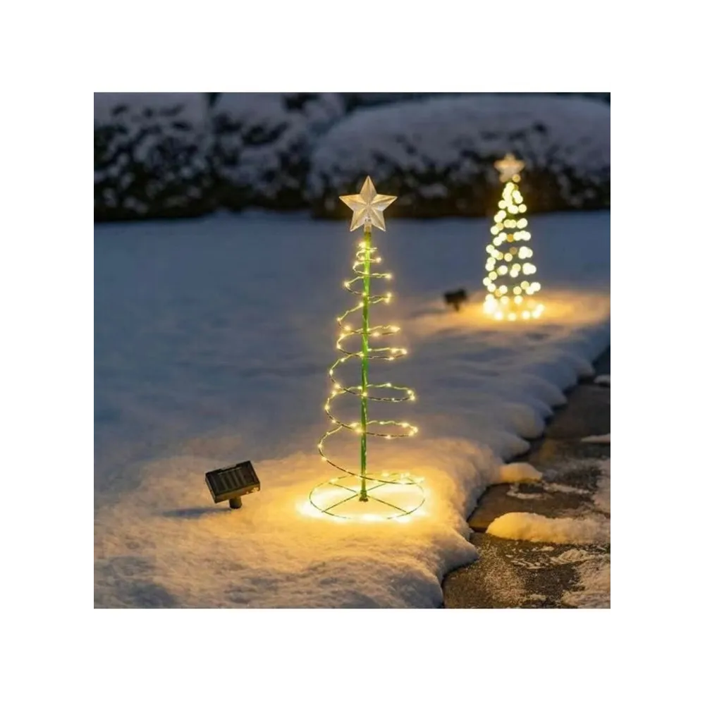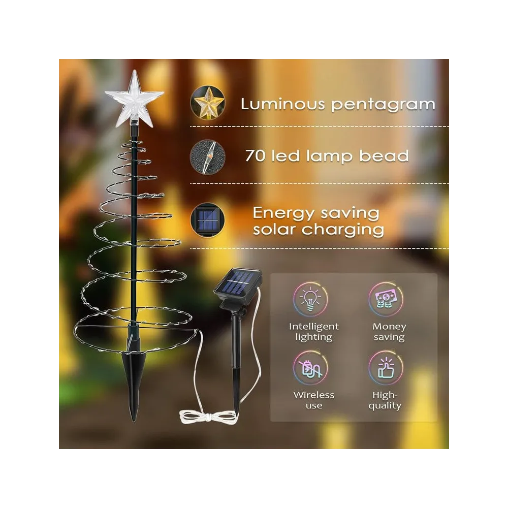 Decoratiunea solara reprezintă un brad de Crăciun stilizat, cu o stea strălucitoare în partea de sus. Acest design evocă atmosfera magică a sărbătorilor de iarnă.