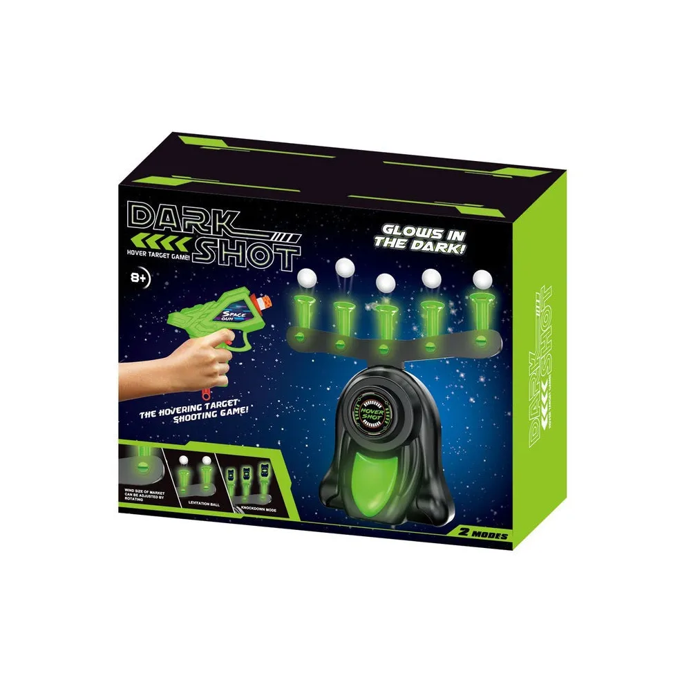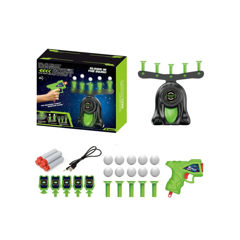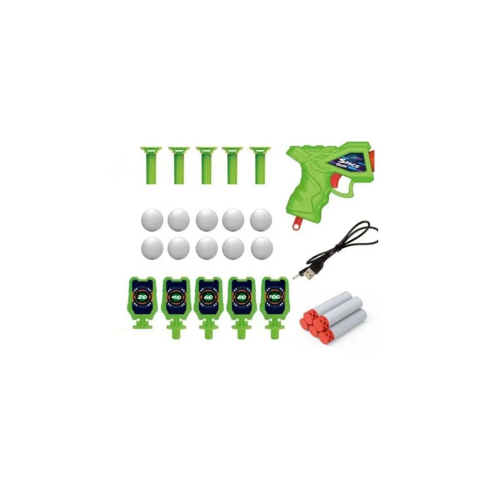 Setul include un stand cu 5 tinte din care iese aer, pe care plutesc cele 5 bile (10 bile incluse in pachet) si pe care trebuie sa le nimeresti, 5 tinte cu punctaj, o pusca si 5 „gloante” de spuma, permitand astfel folosirea munitiei rapid.
