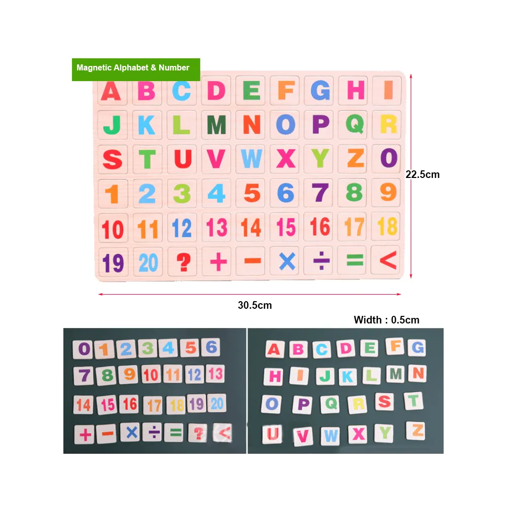Include accesorii: crete, marker, buretel, cifre si litere magnetice colorate.