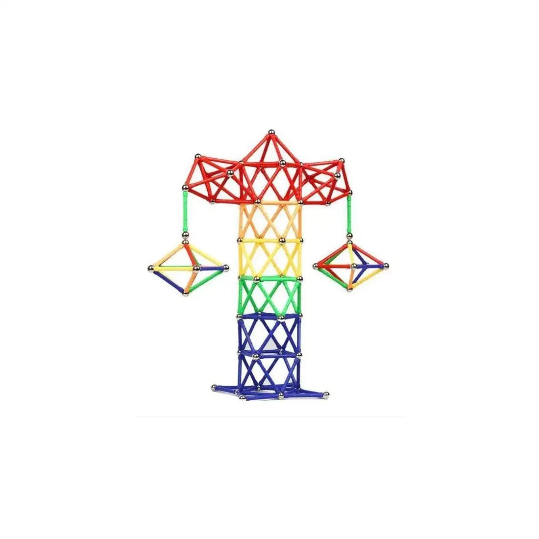 Joc de constructie cu magnet contine 157 de piese (102 bastonase de aproximativ 3 cm, 55 de bile magnetice si un mic ghid de exemple de constructie) si incurajeaza gandirea creativa, logica, vederea in spatiu si dezvolta abilitatile motorii.