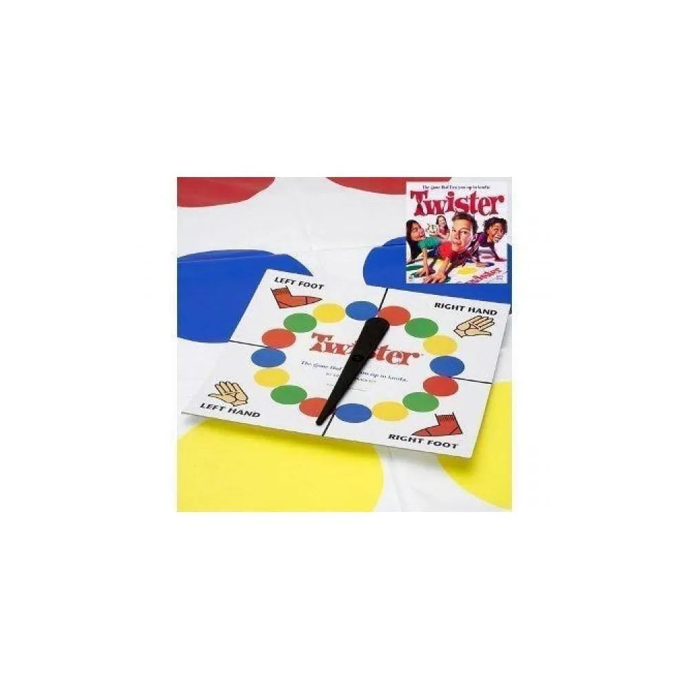 Joc Twister: Se joaca in 2 pana la 4 jucatori. Insa cu cat sunt mai multi participanti,cu atat jocul devine mai distractiv Jocul este alcatuit dintr-o panza de plastic care sta intinsa pe podea si care contine 24 de cercuri dispuse liniar: 6 culoare rosie 6 culoare galbena 6 culoare albastra 6 culoare verde