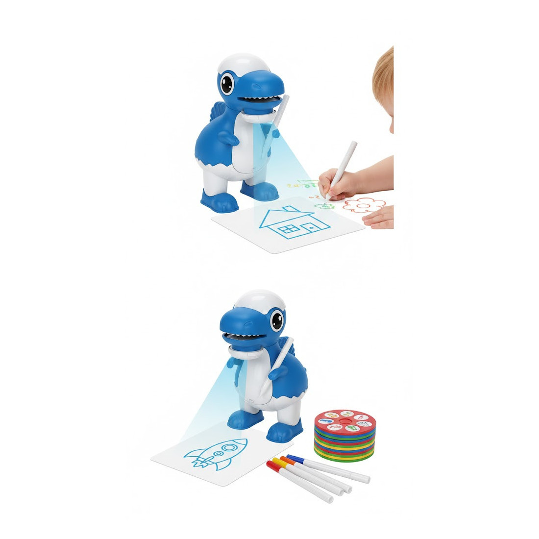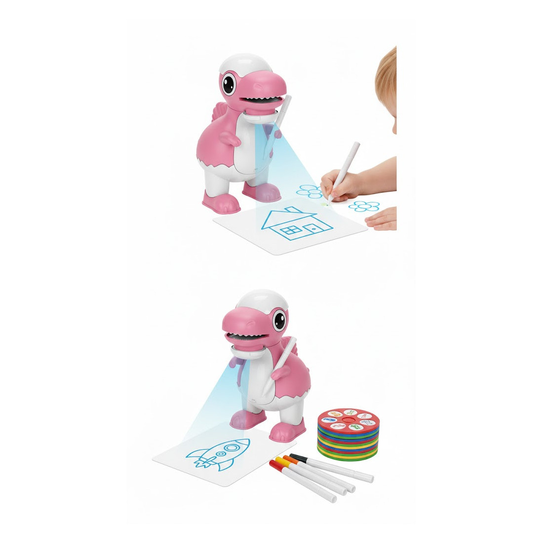 • Cum funcționează? Proiectorul luminează o imagine pe foaie, iar copilul trebuie doar să urmărească liniile pentru a crea desene uimitoare.