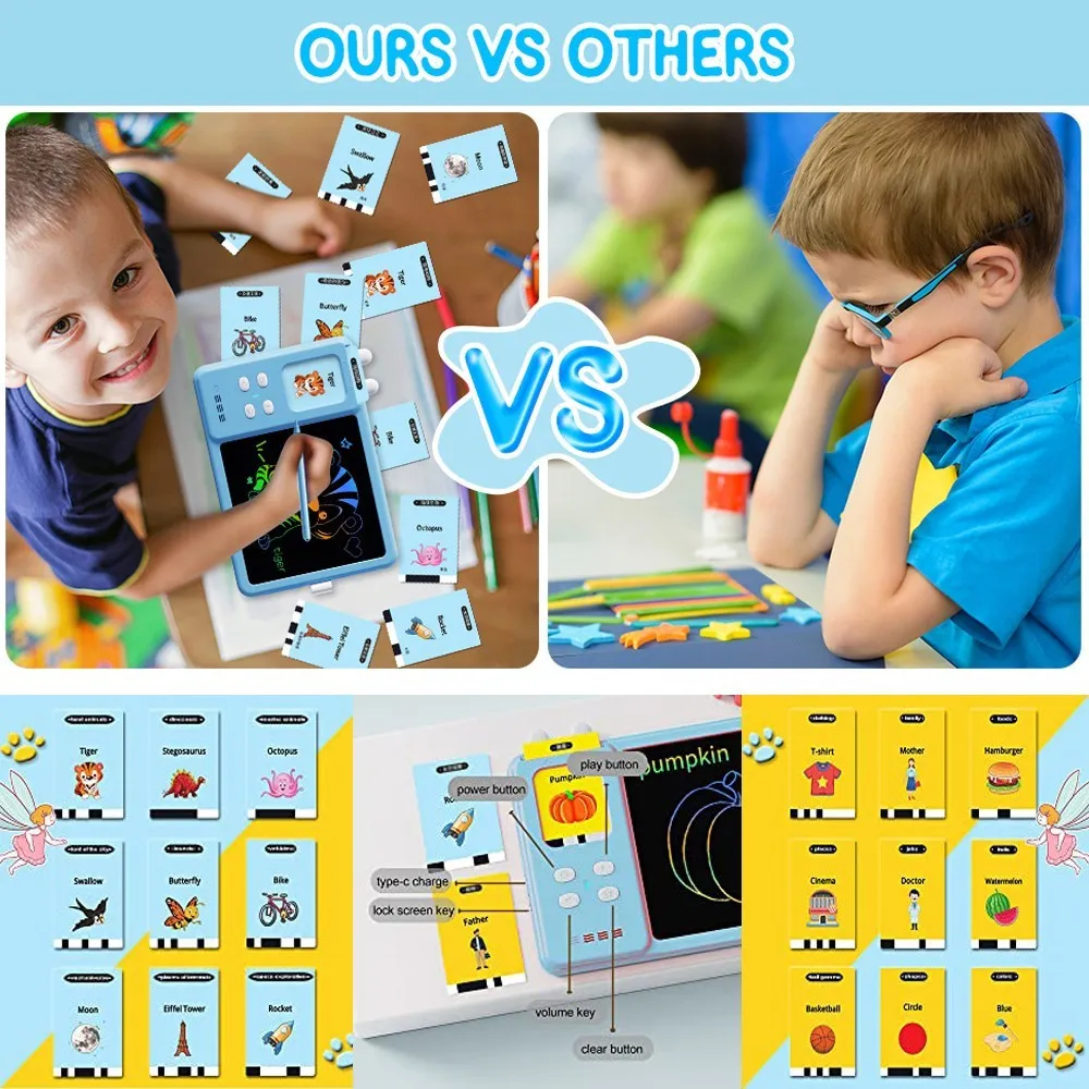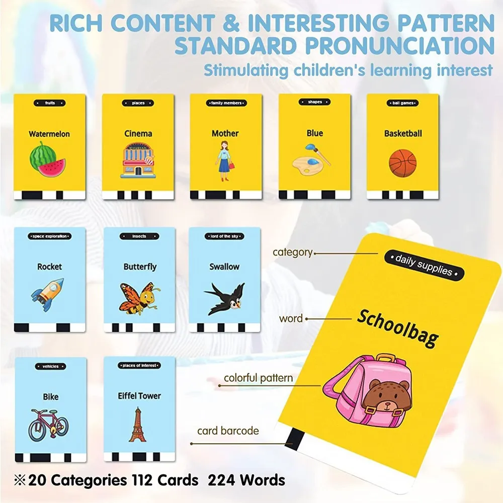 Continut bogat de invatare: produsul vine cu 112 carduri (224 de cuvinte) in categorii, inclusiv alimente, imbracaminte, animale si multe altele. Nu numai asta, dar aceasta jucarie poate citi cuvinte cu pronuntie standard. Copiii pot urma si desena modele.