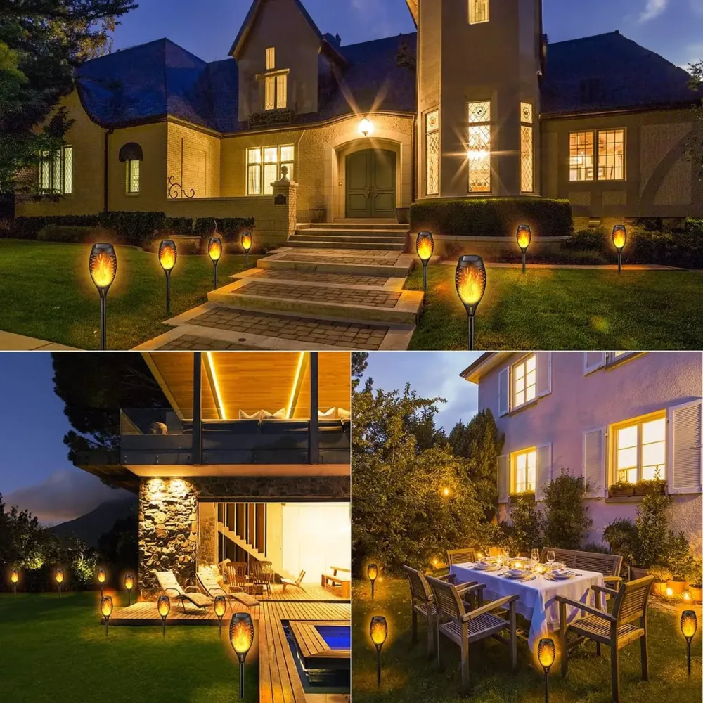 Ledurile sunt programate cu un algoritm inteligent ce le declanseaza la o diferenta de cateva ms. in perechi, astfel rezulta un efect de flacara care arde, avand lumina calda, ce imita perfect culoarea unei flacari cu fitil, real. Torta solara cu LED este prevazuta cu tarus pentru montarea in pamant. Lampa dispune de buton ON/OFF.
