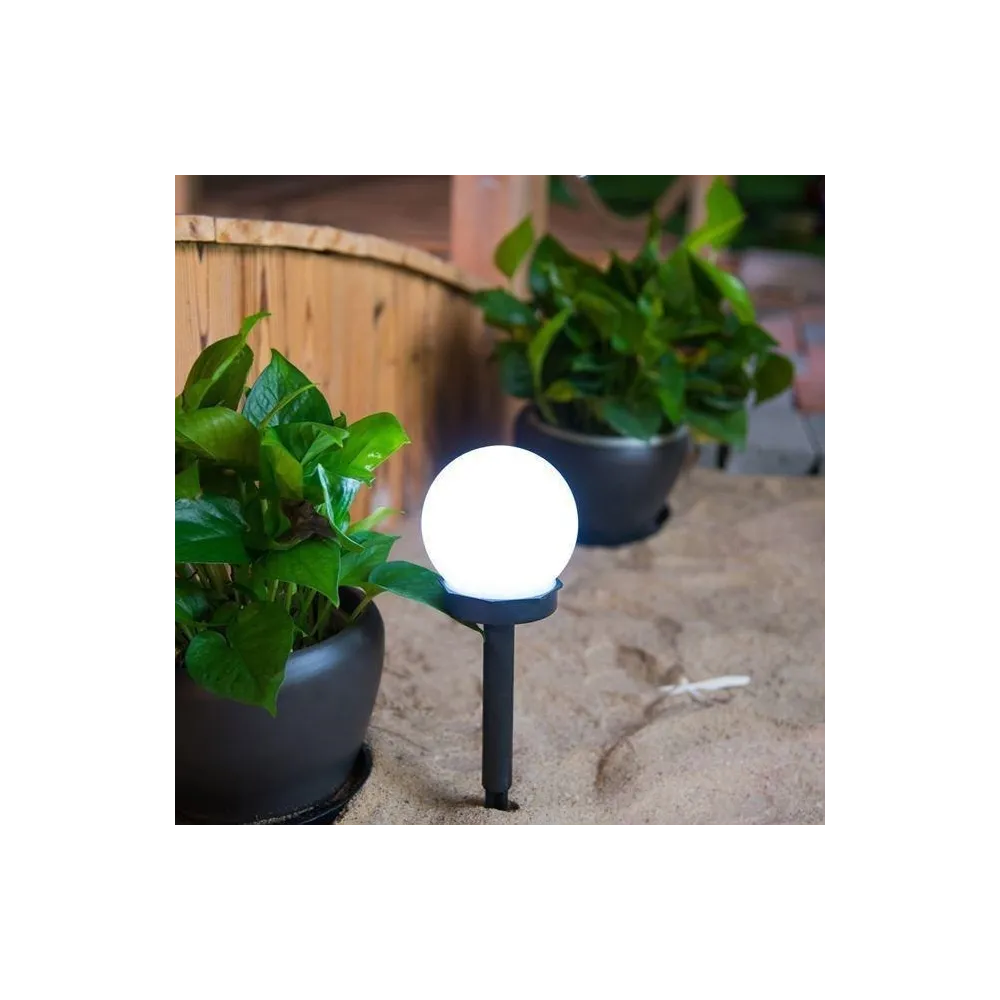Lampa solara sub forma de glob are diametrul de 10 cm si inaltimea de 34 cm. Aceasta este confectionata din plastic, material usor si rezistent, fiind ideala pentru exteriorul locuintei. Lampa se alimenteaza de la lumina directa a soarelui, iar pe timpul noptii gradina, curtea sau terasa vor fi luminate intr-un mod elegant si usor.