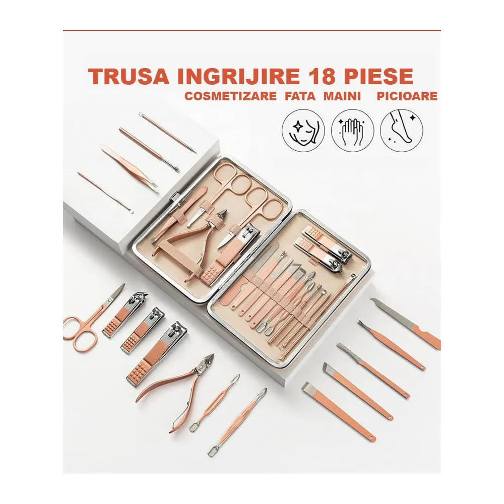 ✅ SET PENTRU INGRIJIRE 18 PIESE - Trusa piese profesionala de ingrijire corporala, formata din 18 instrumente pentru: manichiura, pedichiura si ingrijirea fetei(stilizare sprancene, instrumente anti-acnee, exfoliere. Ideala pentru toate tipurile de unghii, pentru barbati, femei, tineri, sau copii.