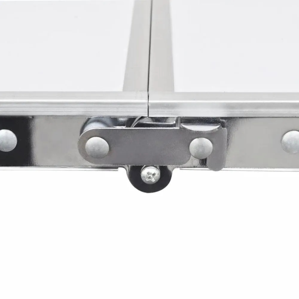 Inaltimea mesei se poate regla la 55 cm, 62 cm si 70 cm. Pentru ca are o structura solida, masa poate suporta o greutate maxima de 30-50 kg. Cadrul din aluminiu si blatul din MDF confera stabilitate acestei mese. Scaunele incluse sunt fabricate din otel tubular si material oxford cu invelis PVC. Masa si scaunelele sunt pliabile si usor de transportat si depozitat.