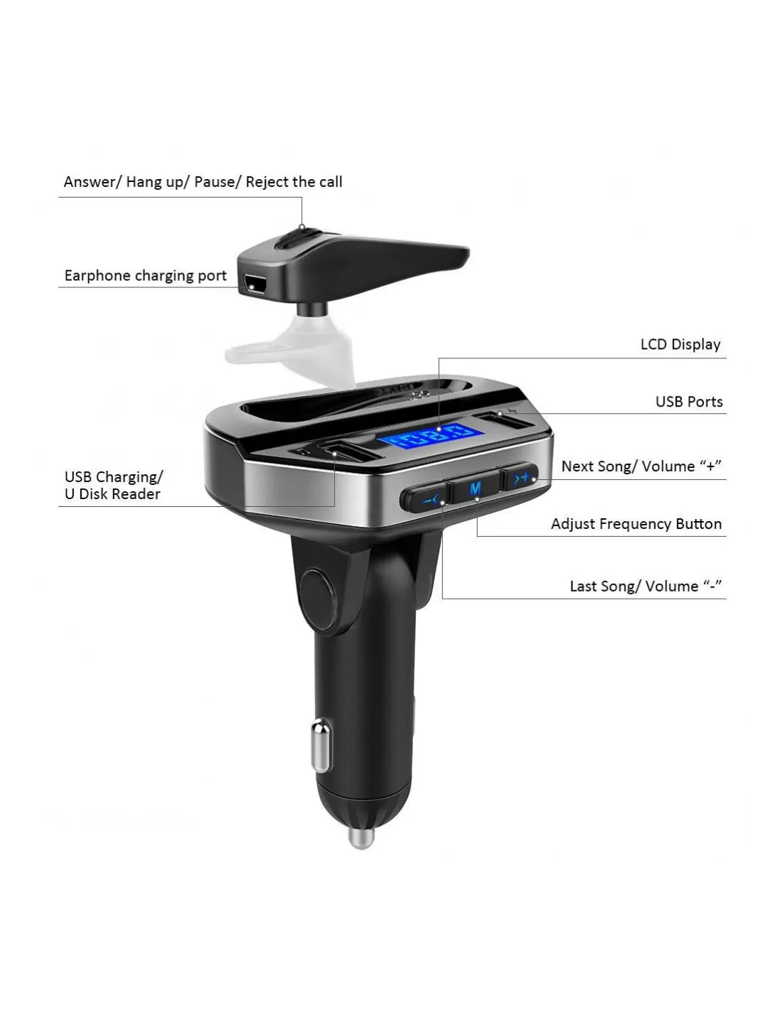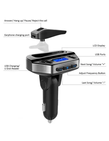 Kit modulator auto MP3 cu casca Handsfree si functie bluetoothKitul modulator pentru auto dispune de cele mai importante functii necesare pentru o conduita preventiva cat si pentru asigurarea confortului, avand functie de hands-free cu casca bluetooth inclusa, functie de incarcare rapida prin USB si functie de modulator cu posibilitate de redare de pe USB sau bluetooth,Specificatii si caracteristici:Kit modulator MP3 + Handsfree cu casca bluetooth V4,2+ EDRCasca bluetooth se incarca in modulatorul FM,Alimentare kit FM: 12V,Distanta maxima: 10 metri,2 x USB ( 1 x incarcare / 1 x mp3 ),USB cu incarcare rapida de 5V/2,1A*Imaginile, culorile si caracteristicile descrise au caracter informativ ?i pot contine mici inadvertente sau diferi ocazional fa?a de produsele prezentate pe site