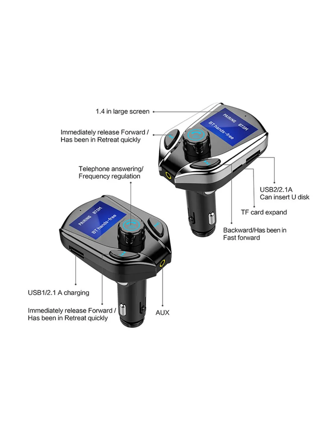 Emitator FM cu afisaj digital, adaptat pentru masina si echipat cu functia Bluetooth si modul mp3, reda muzica de pe card SD, stick USB sau auxiliar.