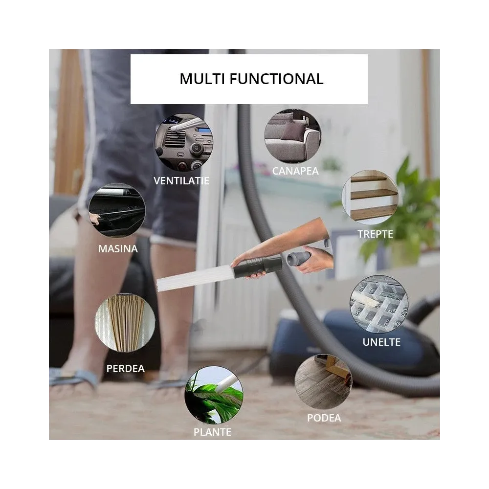 - Dispune de multiple tuburi de aspiratie de dimensiuni mici, flexibile, astfel incat sa poti curata praful din jurul obiectelor, fara a fi nevoit sa le muti