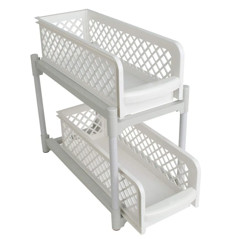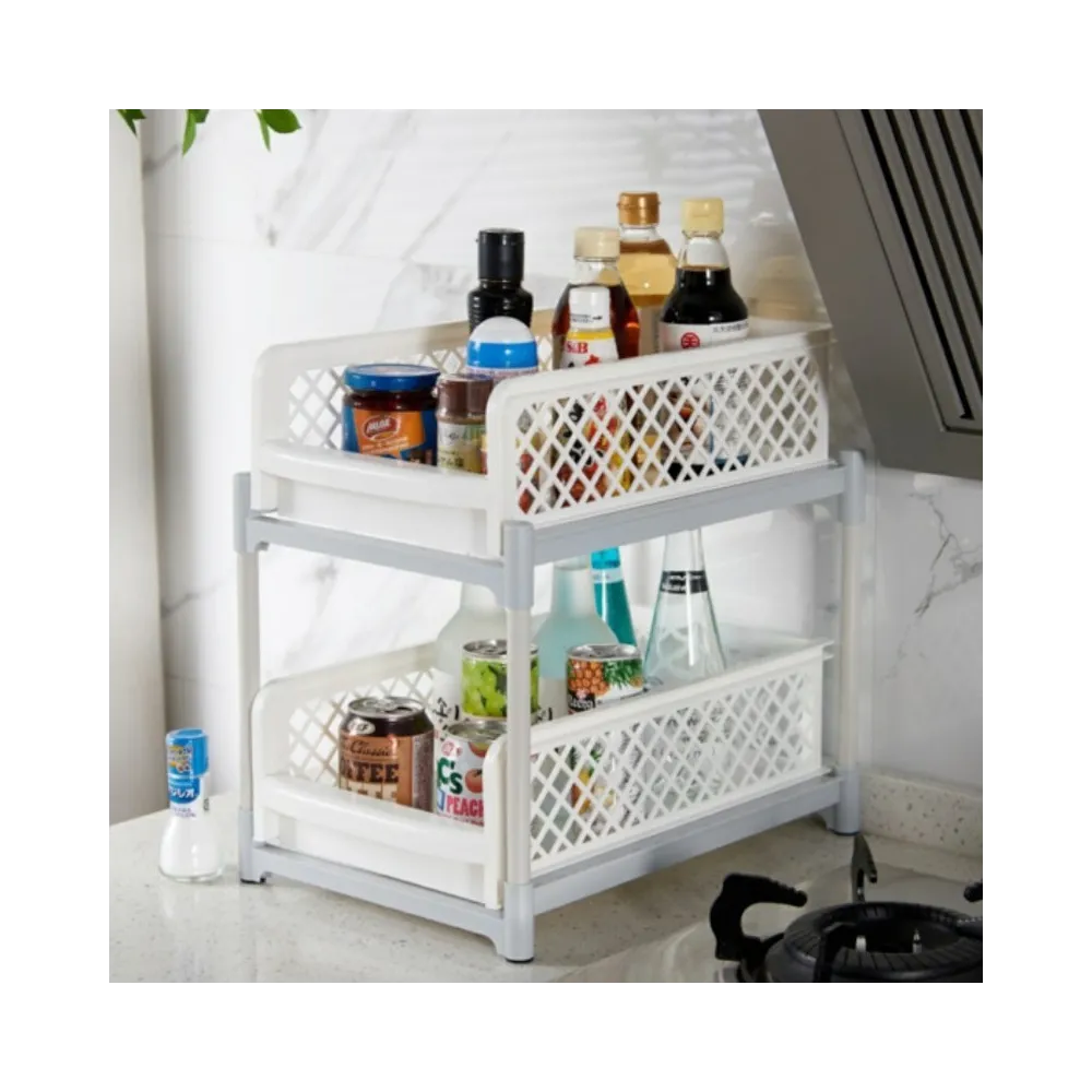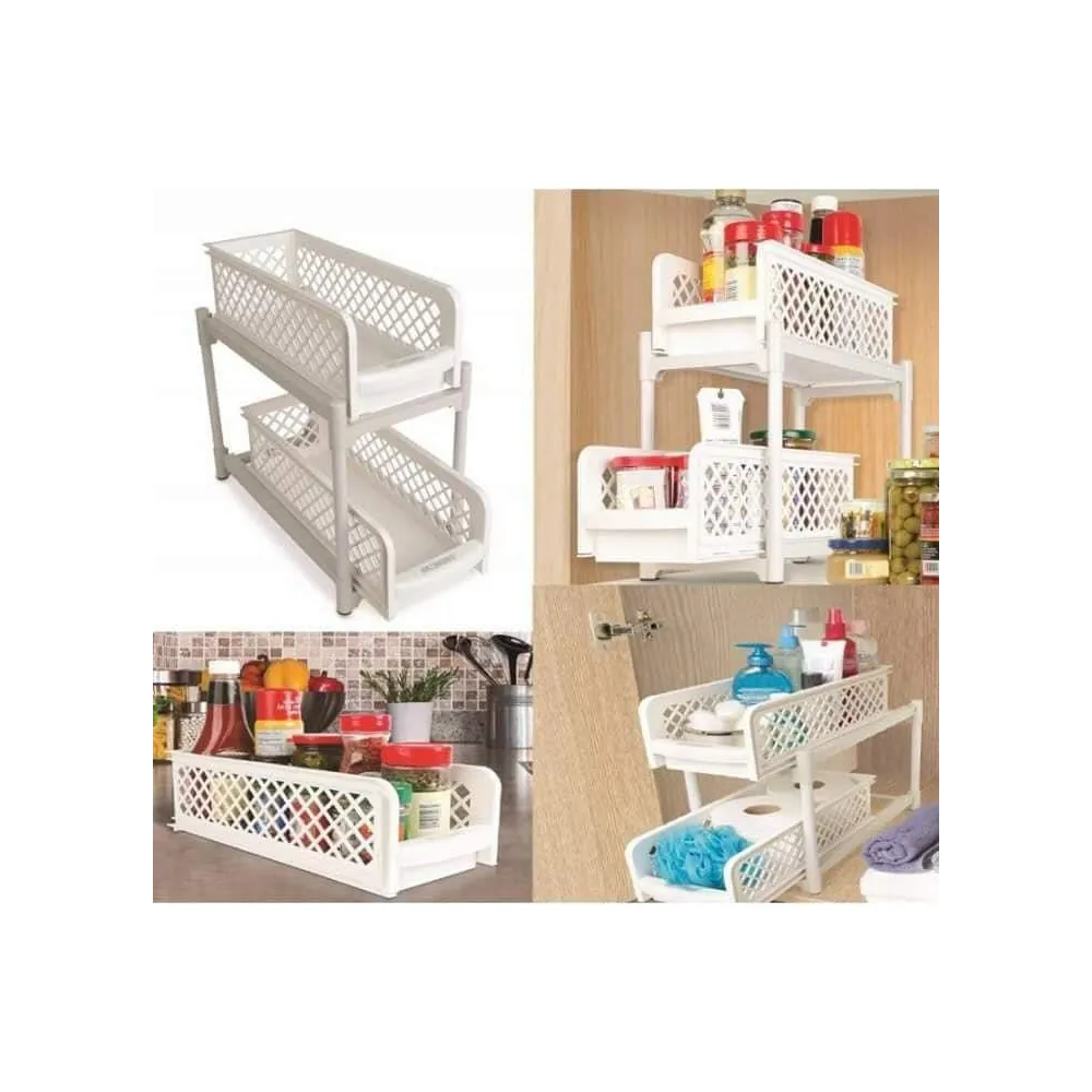 Etajera mica, cu doua rafturi culisante, potrivita pentru organizare si depozitare in bucatarie si baie. Oriunde o veti folosi, veti obtine spatiu suplimentar pentru depozitare. Fiecare sertar gliseaza in afara, ceea ce asigura accesul usor la articolele depozitate. Designul permite vizualizarea continutului din rafturi.
