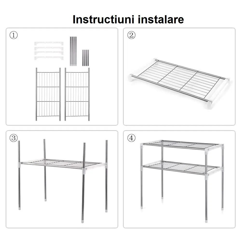 Raftul Multi Storage Rack este ideal pentru spatii mici, compus din 3 compartimente. Raftul multifunctional este realizat din material plastic si otel inoxidabil. Raftul 3in1 poate fi asamblat in mai multe moduri si poate fi utilizat atat in bucatarie cat si pentru depozitarea incaltamintei.