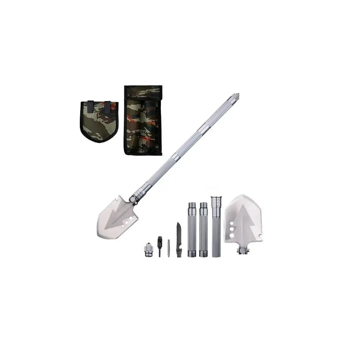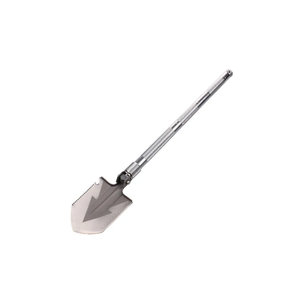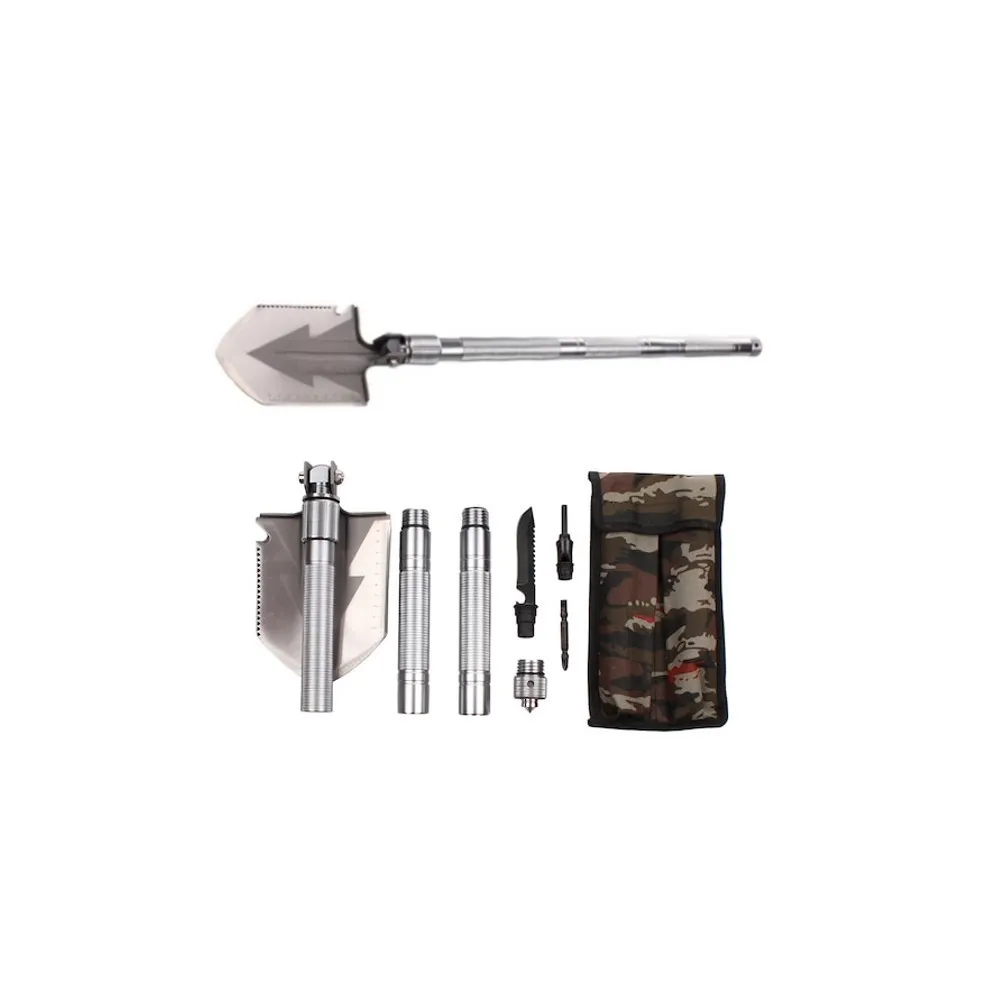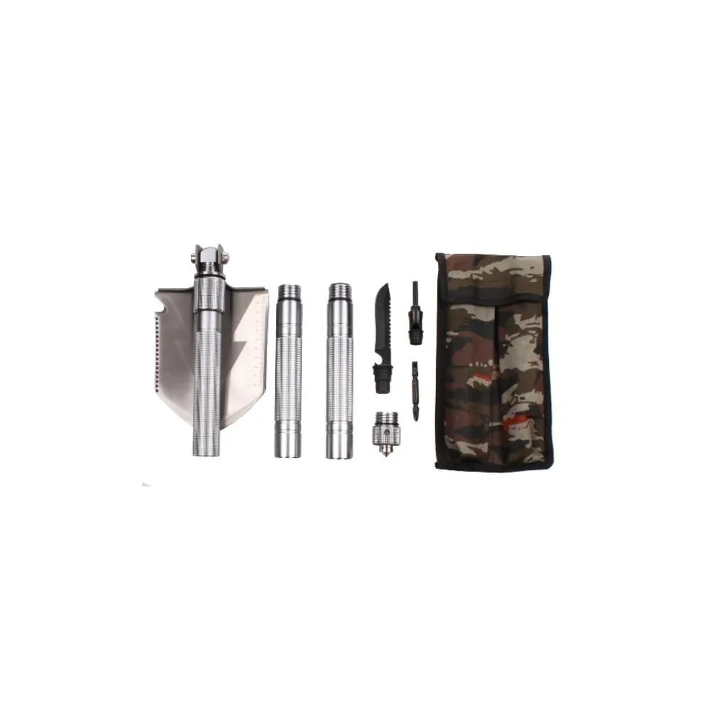 Lopata pliabila multifunctionala va satisface nevoile tuturor utilizatorilor carora le place sa-si petreaca timpul liber in natura. Lopata multifunctionala este excelenta pentru camping, expeditii cercetase sau poate fi folosita in gradina. Lopata este fabricata din otel, manerul are o suprafată zimtata pentru o mai buna prindere. Lopata este multifunctionala, deoarece ofera diverse modificari. Capul lopetii este schimbabil cu un ferastrau, deschizator de sticle, topor, metru cu o valoare de pana la zece centimetri. Lopata este reglabila la 180 de grade, ceea ce permite folosirea lamei ca sapa. Manerul lopetii este impartit in trei parti, pe care le desurubati pur si simplu. In maner veti gasi un cutit tactic, o surubelnita, un fluier si un silex / amnar pentru foc. Capatul manerului ofera un varf metalic pentru spargerea de urgenta a geamului. Intreaga lopata multifunctionala este pliata intr-un pachet cu model de camuflaj. Produsul este potrivit pentru persoane de peste 18 ani sau cu supravegherea unui adult.