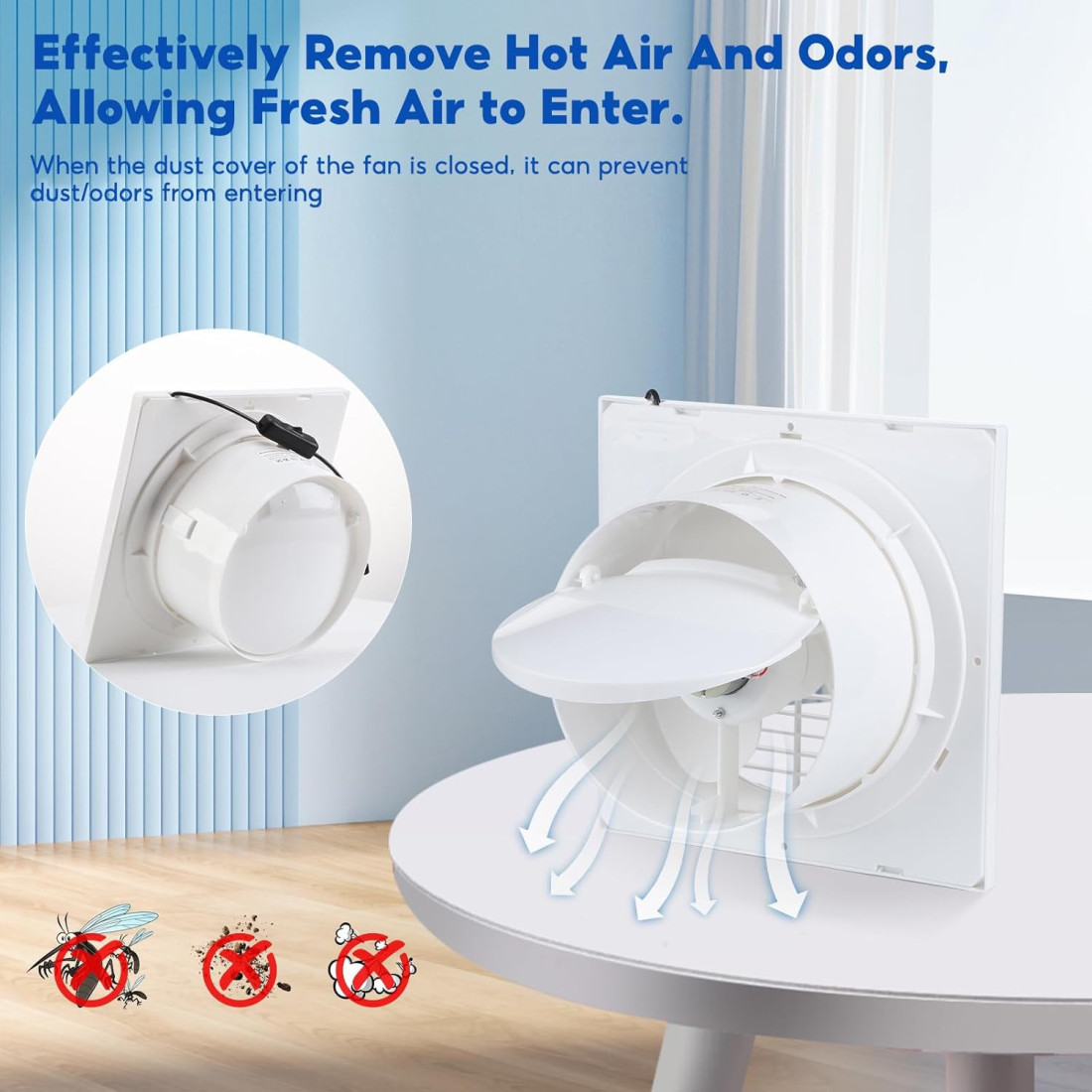 - Protectie Antiretur (Clapeta inteligenta): Ventilatorul este dotat cu un capac posterior inovator care se inchide automat atunci cand elicea se opreste. Acesta previne eficient patrunderea insectelor, a prafului si a mirosurilor din exterior.