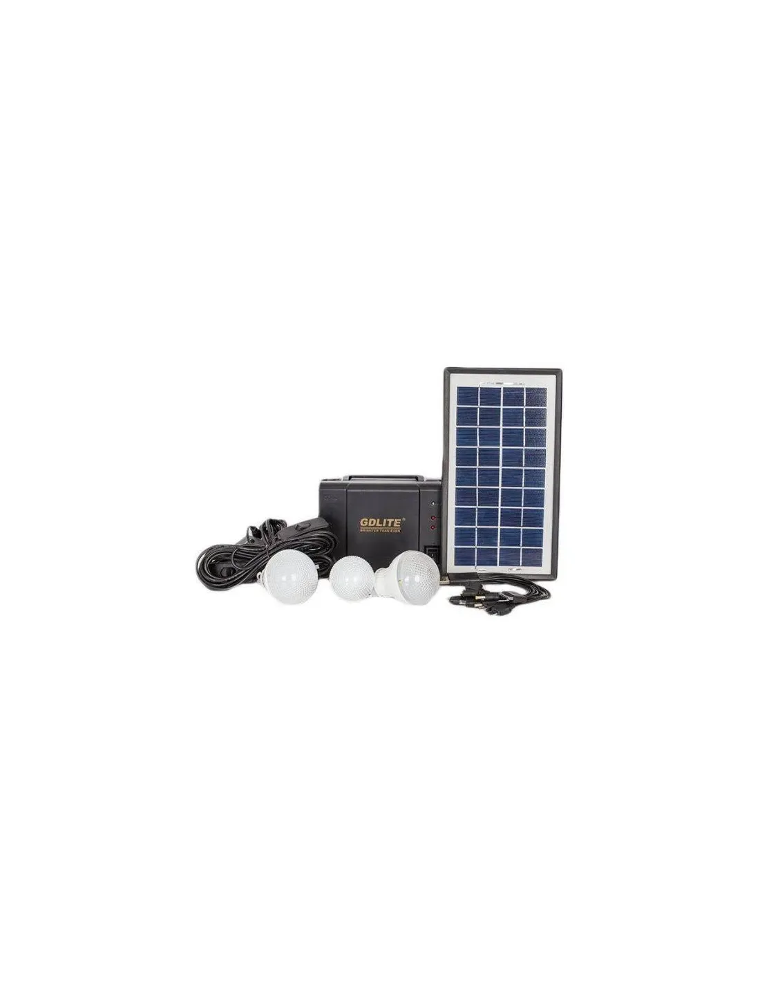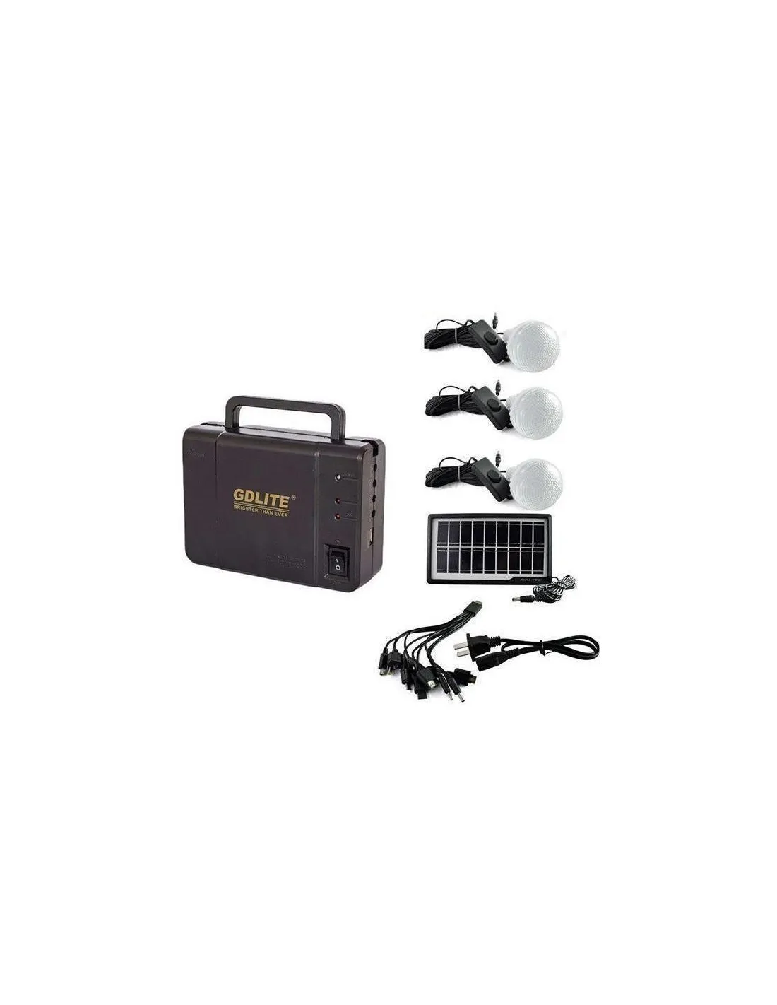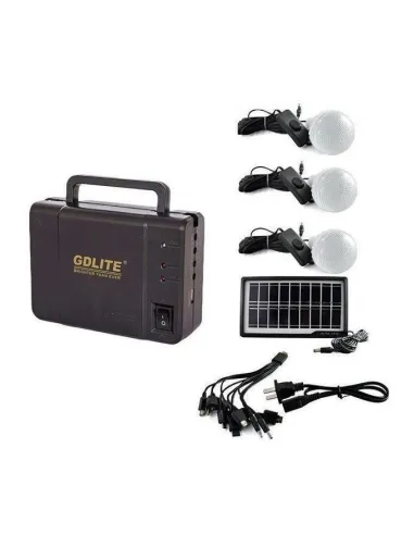 Kit-ul fotovoltaic cu panou solar si slot USB, GDLite GD-8006A contine 3 becuri cu LED 3x3W, acumulator 6V 4Ah si panou solar 9V 3.5W.