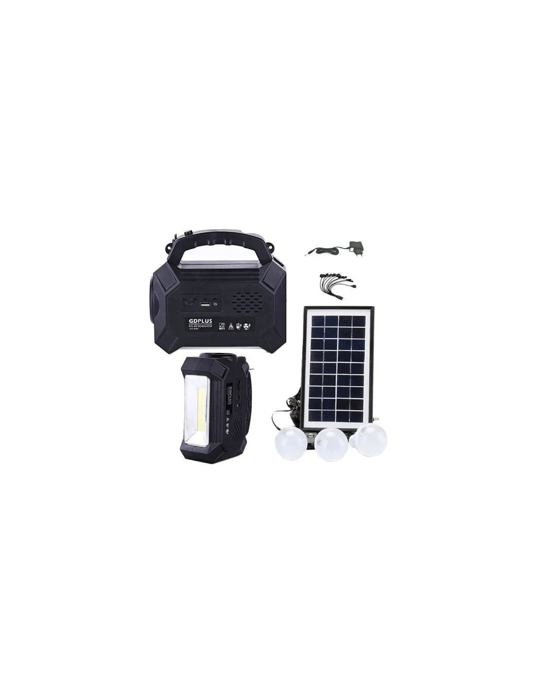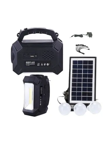 Kit Solar de iluminat si alimentare dispozitive la USB, cu lanterna LED si trei becuri cu LED-uri. Sistemul cu incarcare solara pentru alimentare si iluminare este solutia ideala pentru situatiile in care nu dispuneti de energie electrica. Fie ca sunteti intr-o zona izolata, in camping sau in timpul unei pene de curent, kit-ul solar va ofera toate facilitatile de care aveti nevoie: iluminat portabil prin intermediul celor 3 becuri cu LED-uri SMD si cu ajutorul lanternei cu led si incarcare telefoane mobile si alte dispozitive de la acumulatorul de 4V 4Ah inclus in sistem, pe langa functia de Radio FM, care va ajuta sa ascultati muzica preferata oriunde.