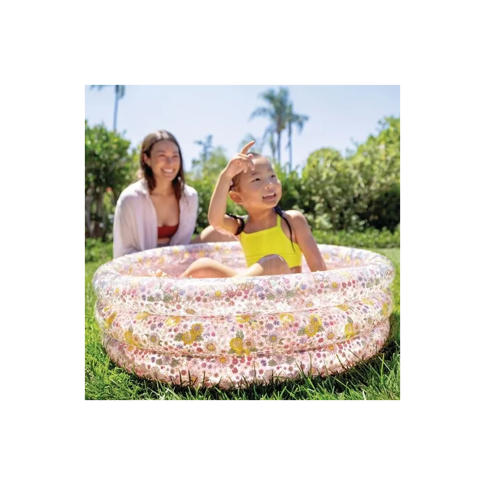 O piscină gonflabilă colorată cu trei camere, care se potrivește în grădină, unde cu siguranță le va aduce bucurie copiilor.