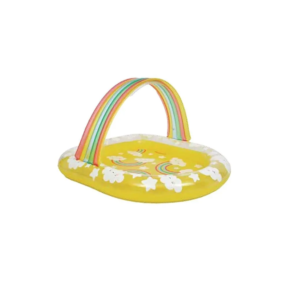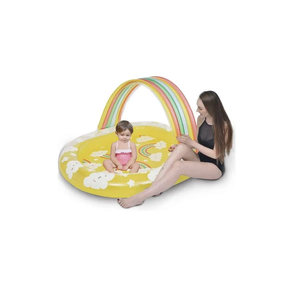 Piscina pentru copii, de culoare galbena cu model nor si curcubeu, acoperita pentru a proteja copilul de soare.