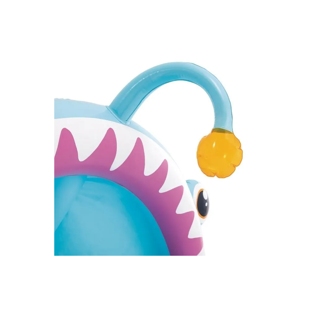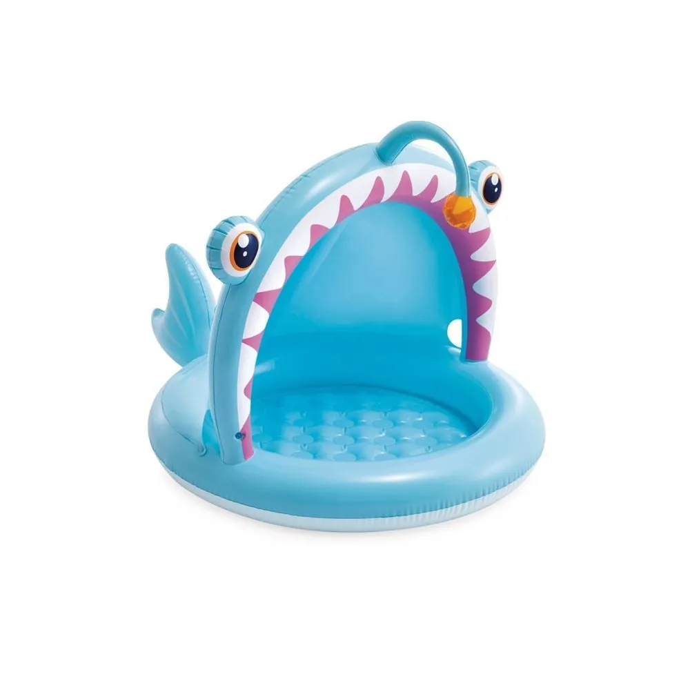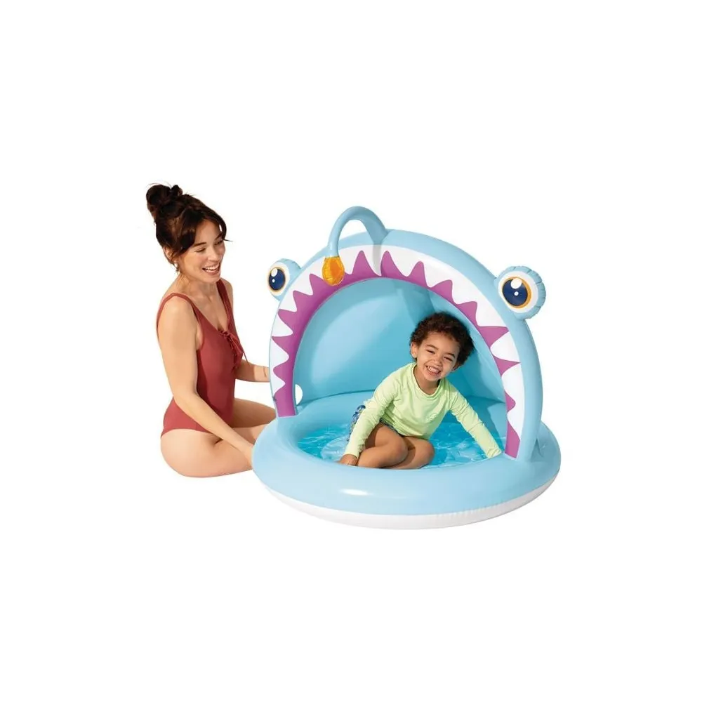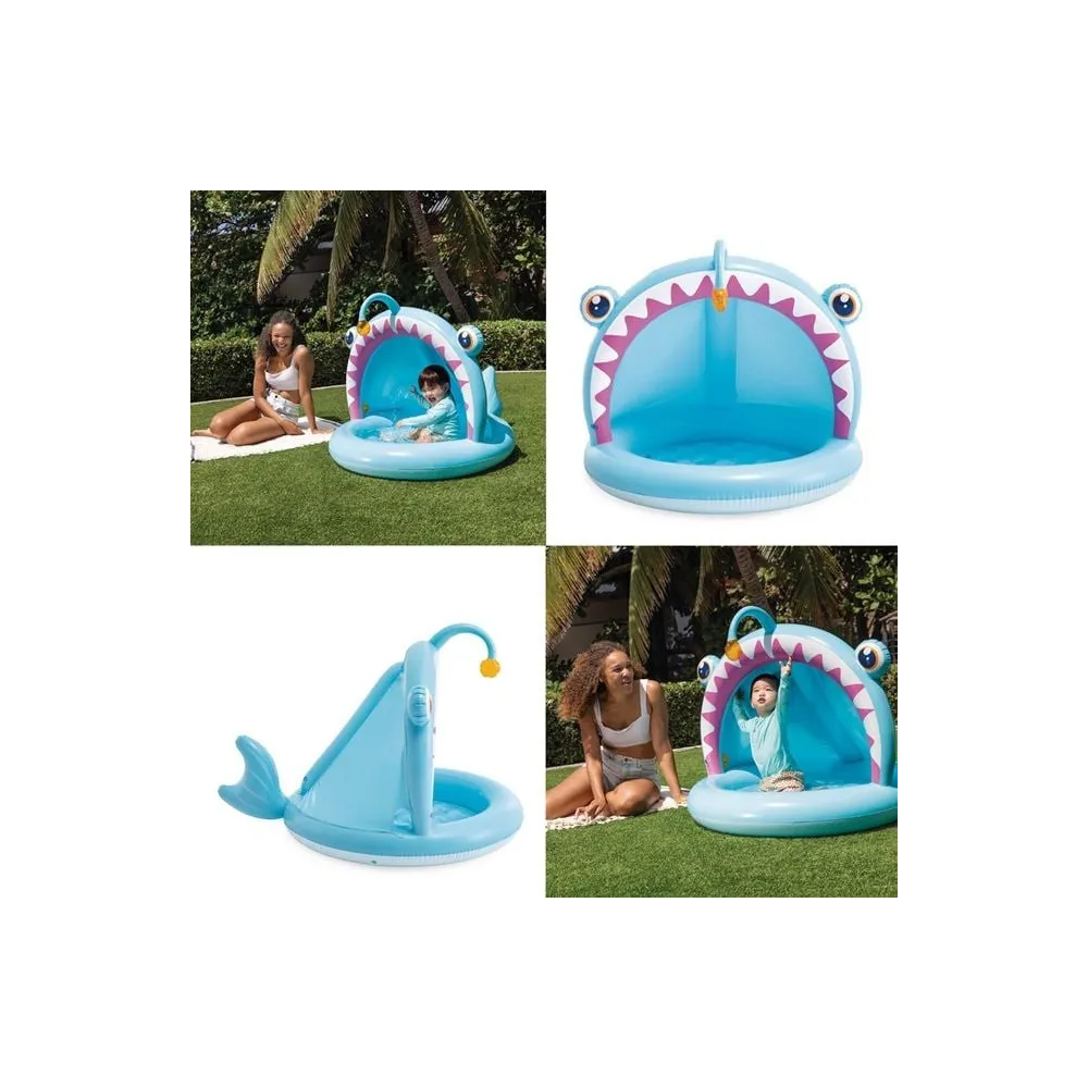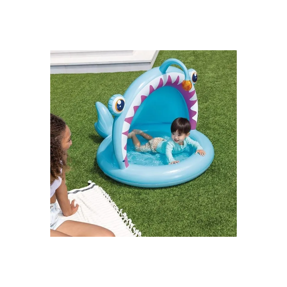 Piscina pentru copii, de culoare bleu, cu model pestisor, acoperita pentru a proteja copilul de soare. Cu baza moale si gonflabila. Petic de reparatie inclus.