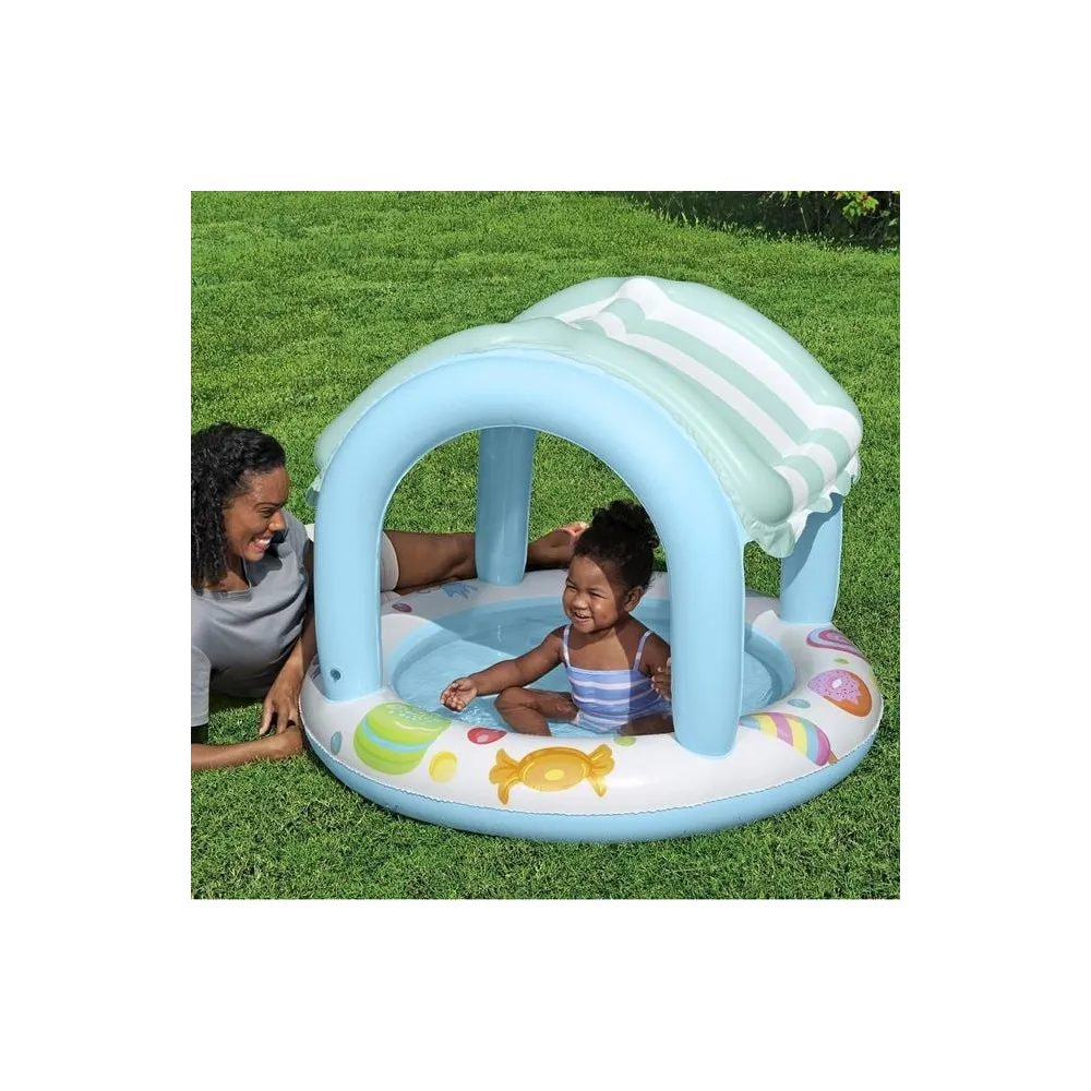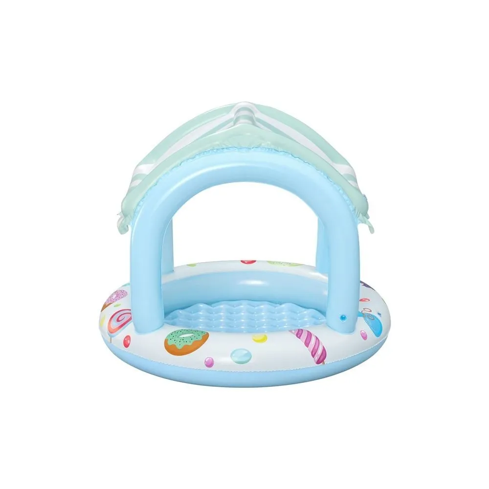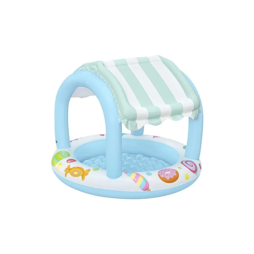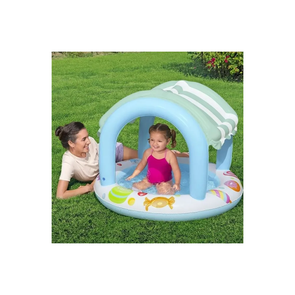 Piscina pentru copii, de culoare turcoaz, cu acoperire integrata ce ofera protectie UV pentru siguranta copilului, decorata cu modele de inghetata, gogosi si acadele, si cu podea moale gonflabila pentru un plus de confort. Include o piesa de reparatie. Oferiti-le copiilor ore nesfarsite de joaca racoroasa in zilele toride de vara. Alegeti dimensiunea piscinei in functie de spatiul disponibil – pentru cei mici, va fi ca si cum ar fi in vacanta in fiecare zi! *