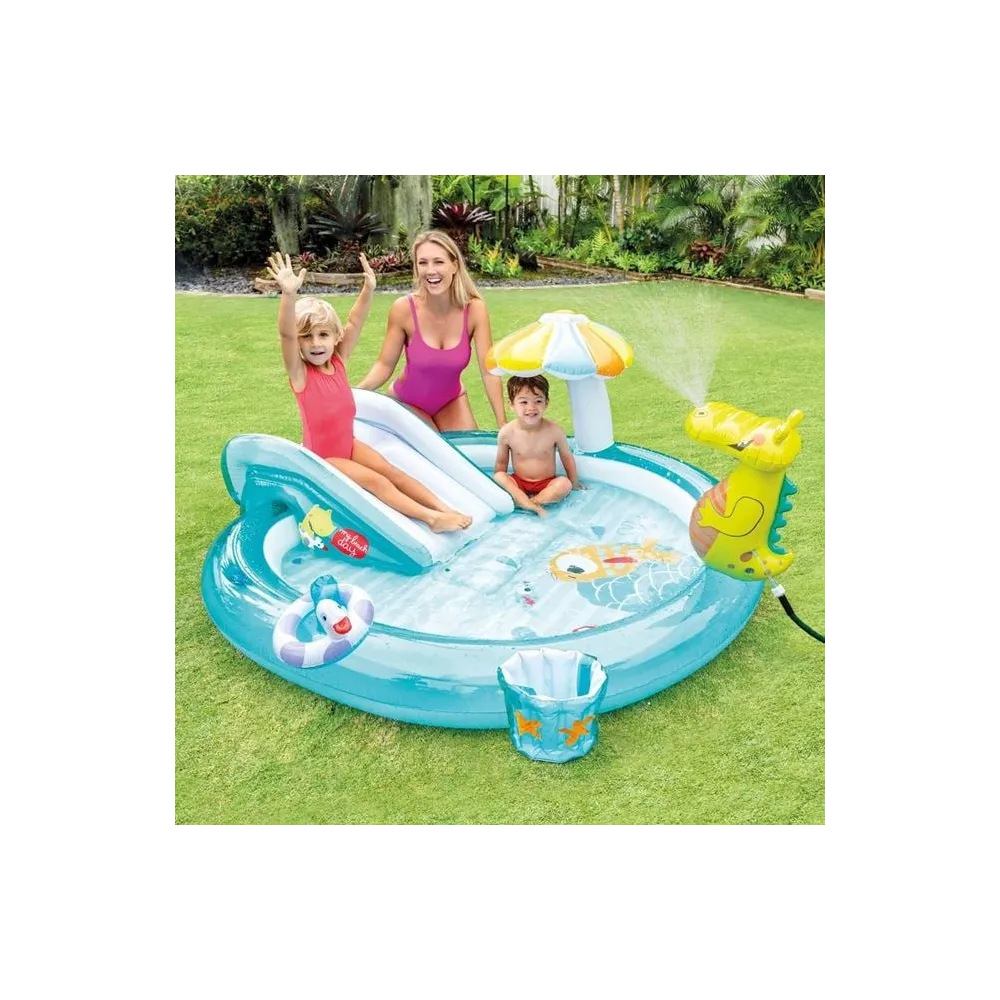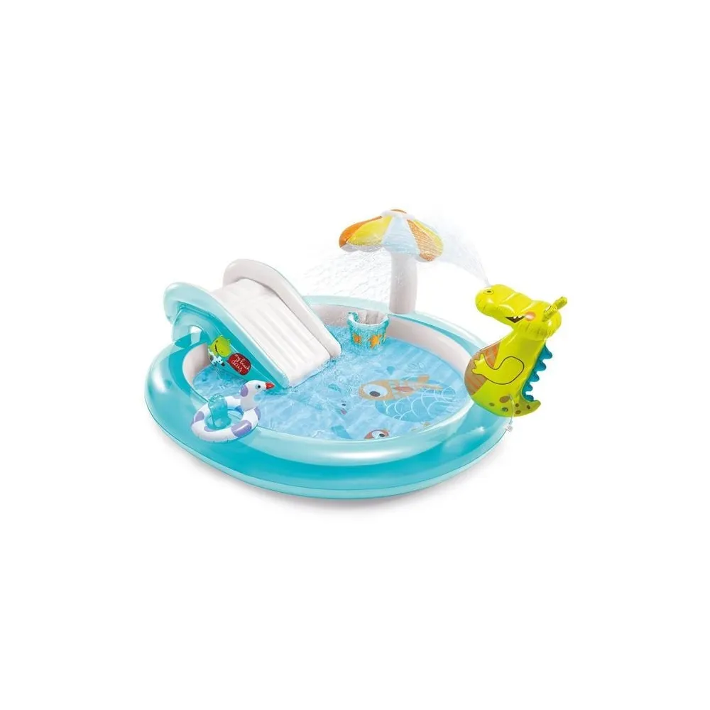 Piscina spatiu de joaca crocodil cu jet incorporat cu conectare la furtun, saltea de aterizare pentru mai mult confort, supapa de golire si desene placute. Contine petic de reparatii.