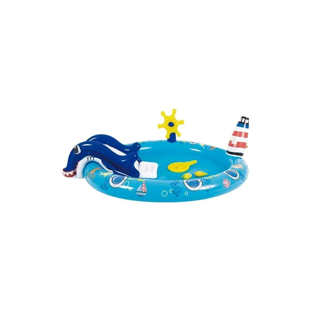 Creează o aventură nautică chiar în grădina ta cu această piscină gonflabilă pentru copii, inspirată din universul naval! Dotată cu tobogan integrat, fântână arteziană (far activabil cu furtun) și volan de joacă, piscina oferă o experiență interactivă și răcoritoare pentru cei mici, ideală în zilele toride de vară.