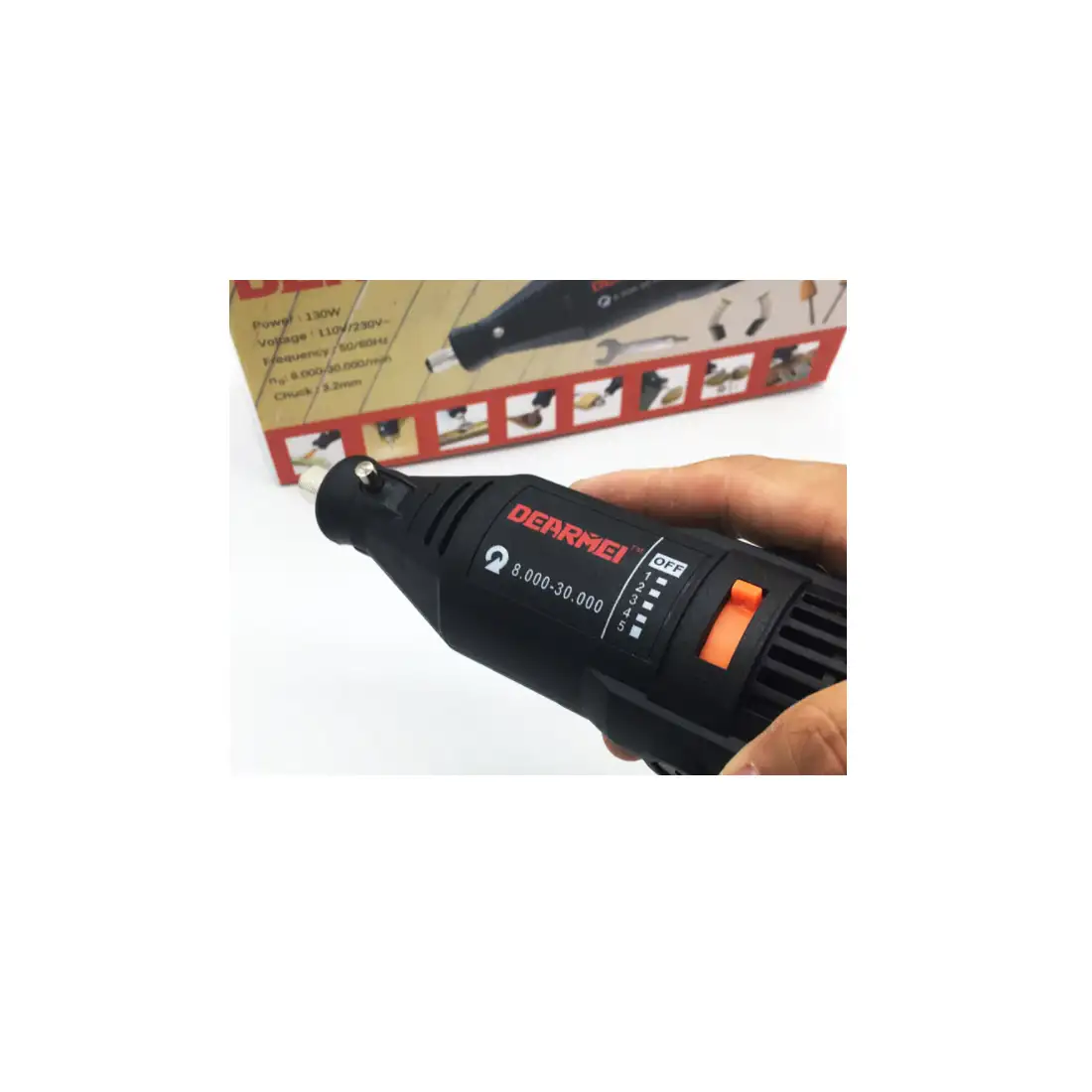 Mini-polizor electric Dearmei cu o putere de 130 W are o reglare continua a rotatiilor de la 8.000 la 30.000. Unealta are o forma ergonomica care ofera confort in timpul lucrului pe termen lung cu aceasta.