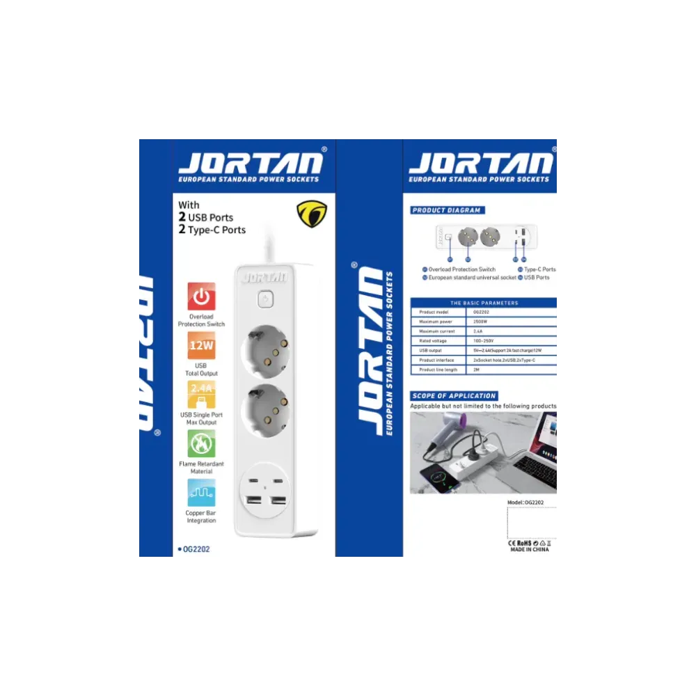Priză Multiplu Jortan – 2 Prize Standard + 2 USB + 2 USB-C