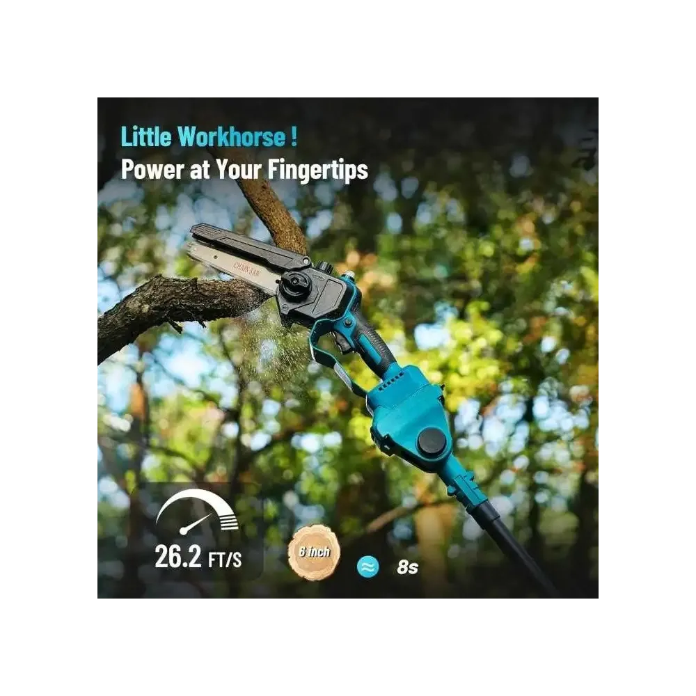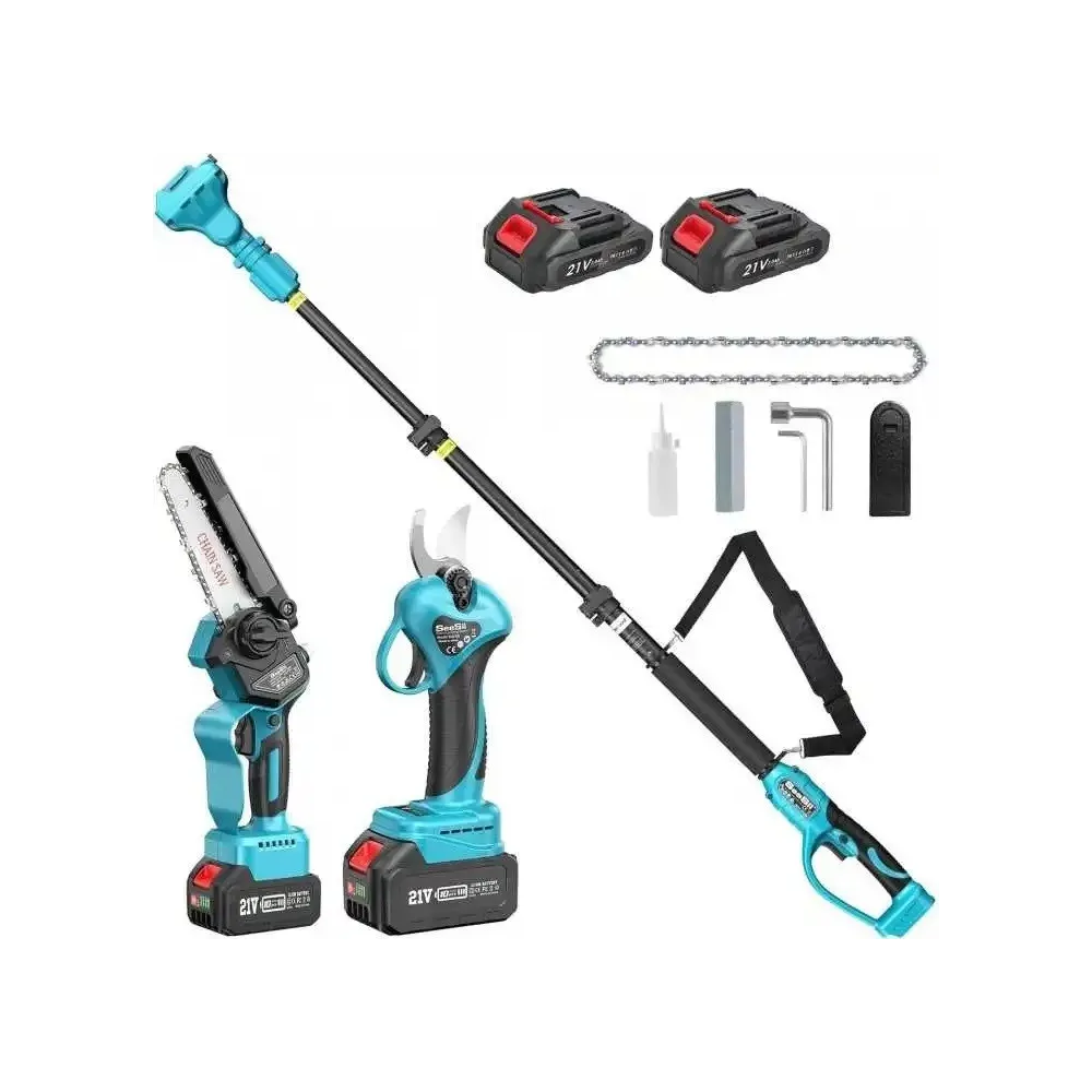 Foarfecă de grădină și o mini drujbă de 6 inch alimentată de un sistem de 48V, echipat cu 2 acumulatori pentru o durată prelungită de utilizare. Acest set este ideal pentru lucrări de tăiere a ramurilor și întreținerea plantelor, având un braț telescopic de 2 metri care permite accesul în zone mai greu de ajuns, precum și un unghi reglabil de tăiere, oferind flexibilitate și eficiență. Un partener de încredere pentru grădinari profesioniști sau amatori care doresc să lucreze rapid și eficient în grădină.