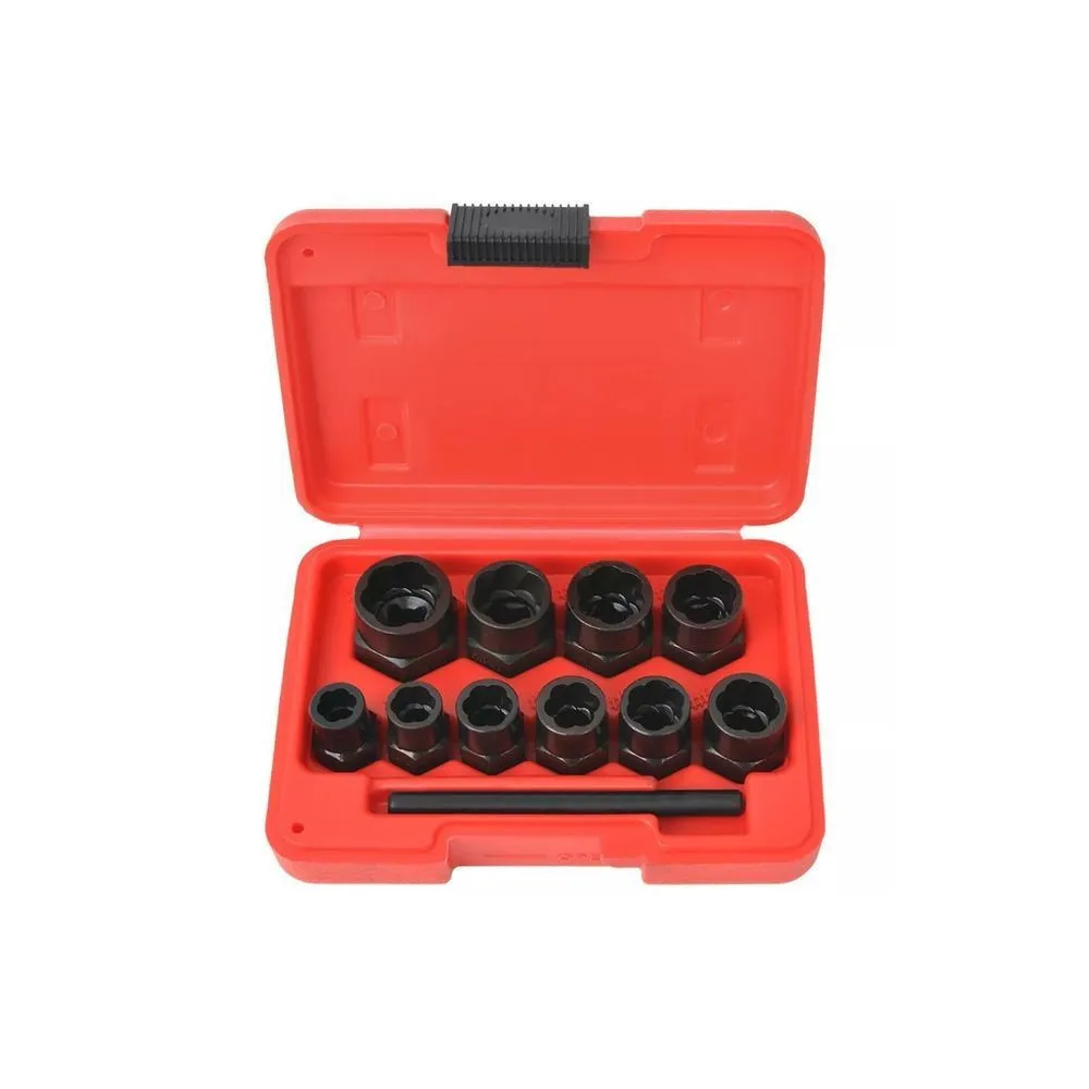 Acest set pentru extragere șuruburi format din 11 piese este perfect pentru slăbirea șuruburilor și piulițelor. Acest set de scule profesional este ideal pentru uz comercial și ocazional. A fost proiectat special pentru a îndepărta piulițe deteriorate sau corodate fără a deteriora filetul șurubului.