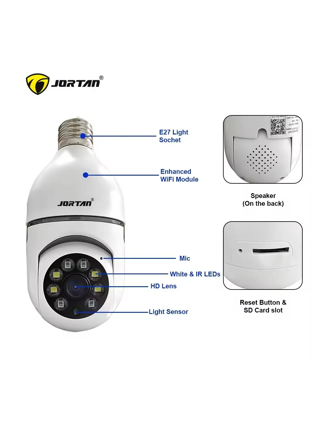 Camera de supraveghere WiFi cu iP, Jortan JT-8177 ofera posibilitatea de supraveghere in spatiul protejat prin rotire pe orizontala pana la 360° si pe verticala pana la 90°. Camera supraveghere Jortan JT-8177 cu soclu E27 si vedere nocturna este ideala pentru a proteja tot ce conteaza pentru tine: casa, masina, afacerea, supravegherea copiilor si a animalelor de companie.