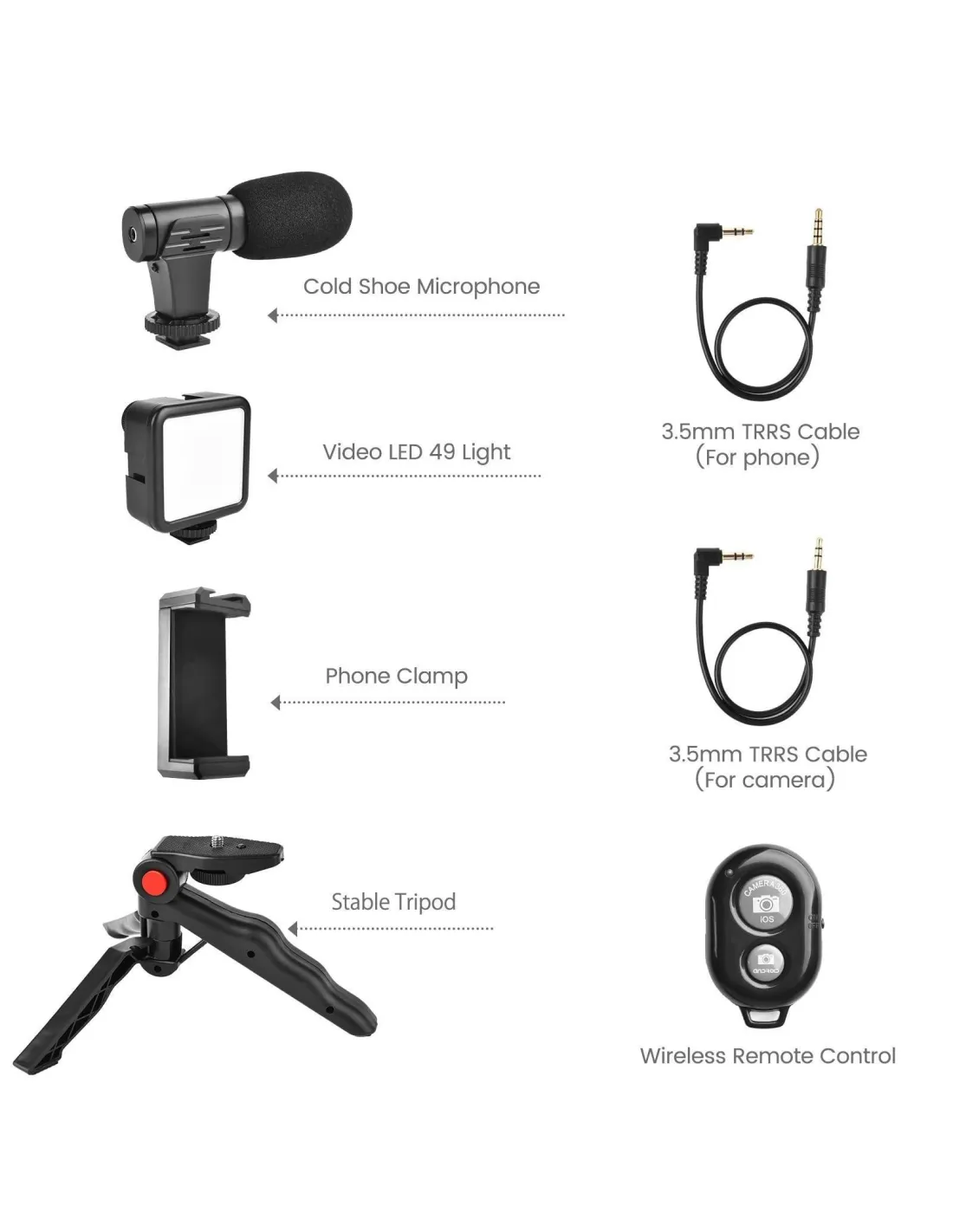 Un trepied multifunctional care dispune de o telecomanda wireless incorporata detasabila si un suport pentru telefon inteligent/camera de actiune, impreuna cu un suport care ajuta la montarea tuturor elementelor incluse in acest kit, astfel incat sa va puteti conecta telefonul sau camera, aceasta este solutia dumneavoastra completa de video vlogging.