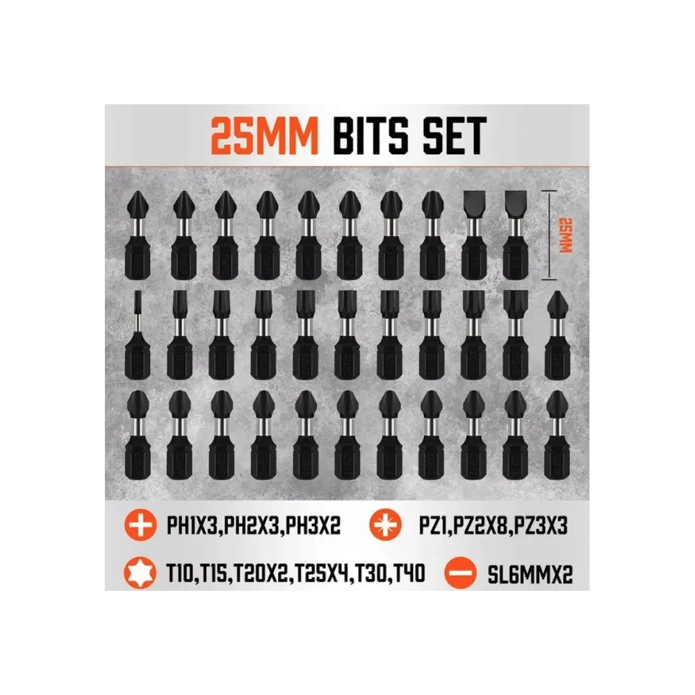 Biti din otel aliat S2 de calitate industriala, intariti pentru a reduce uzura, cu finisaj rezistent la rugina. Toate tratate termic pentru a asigura duritate ridicata (HRC60+/-), cuplu mare si rezistenta la abreziune